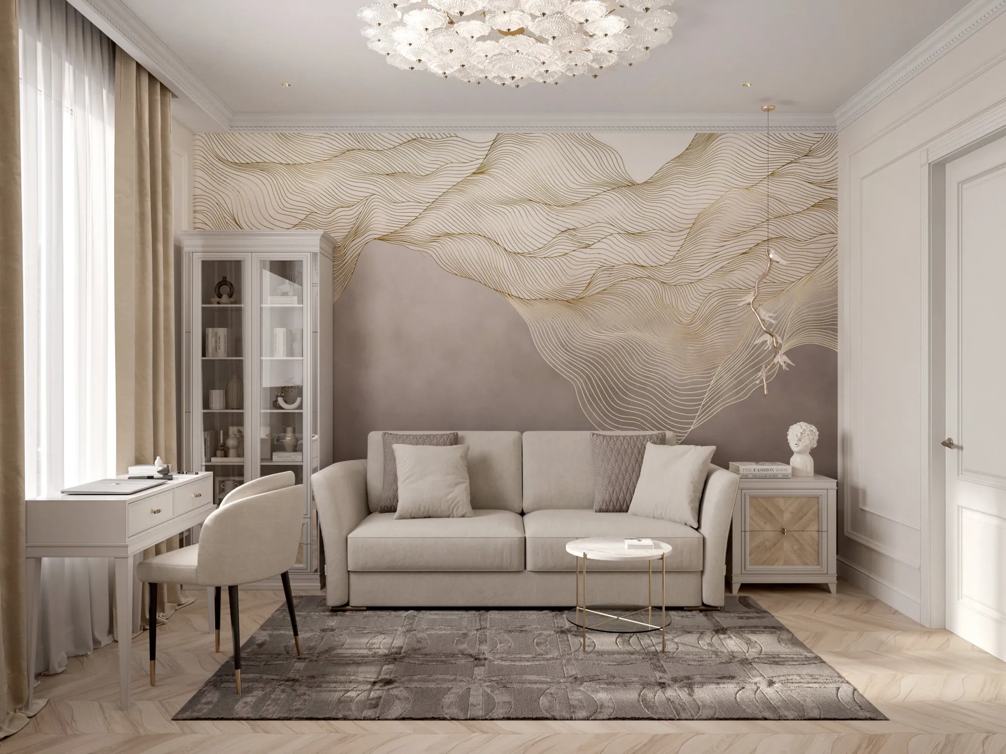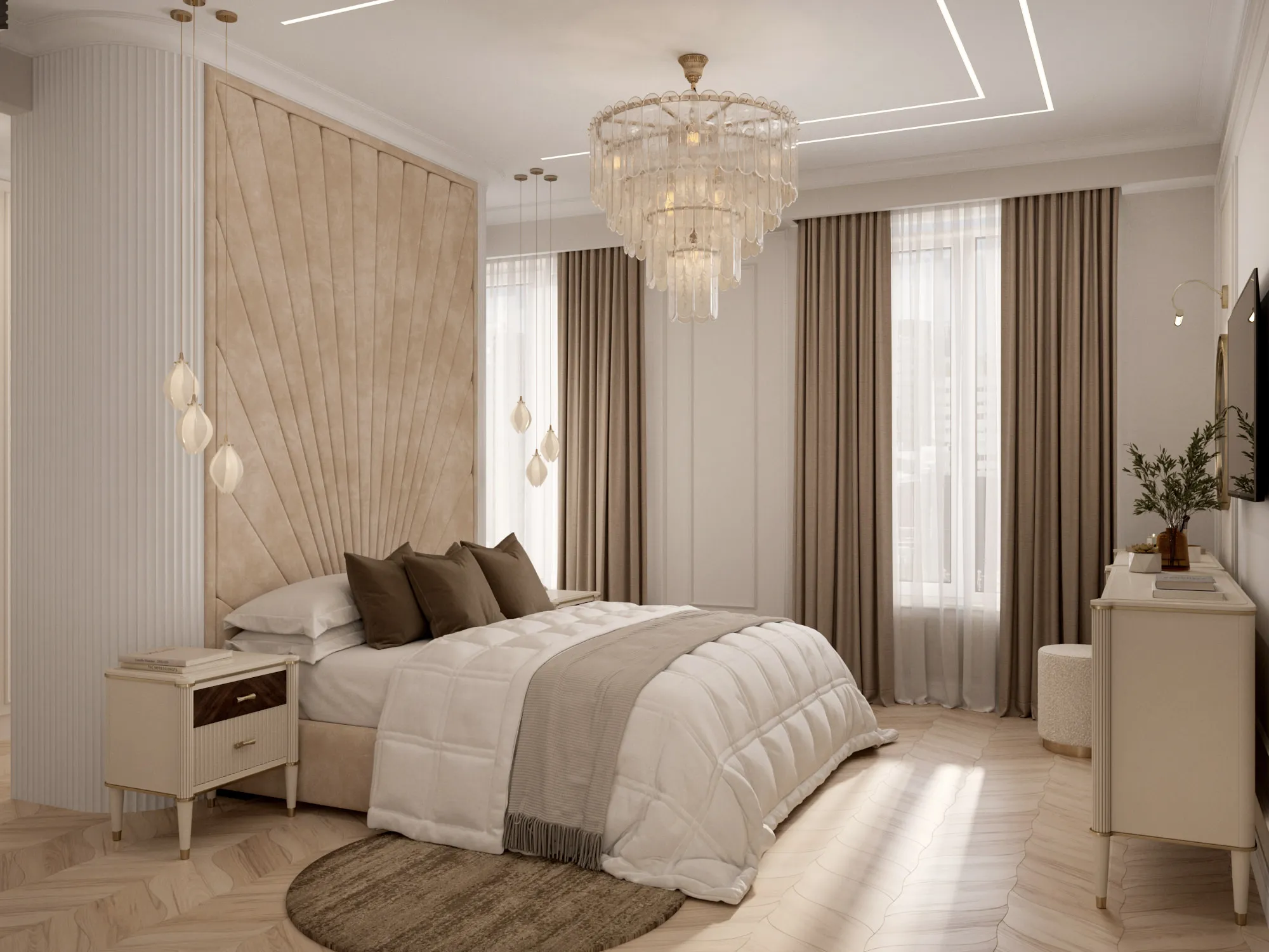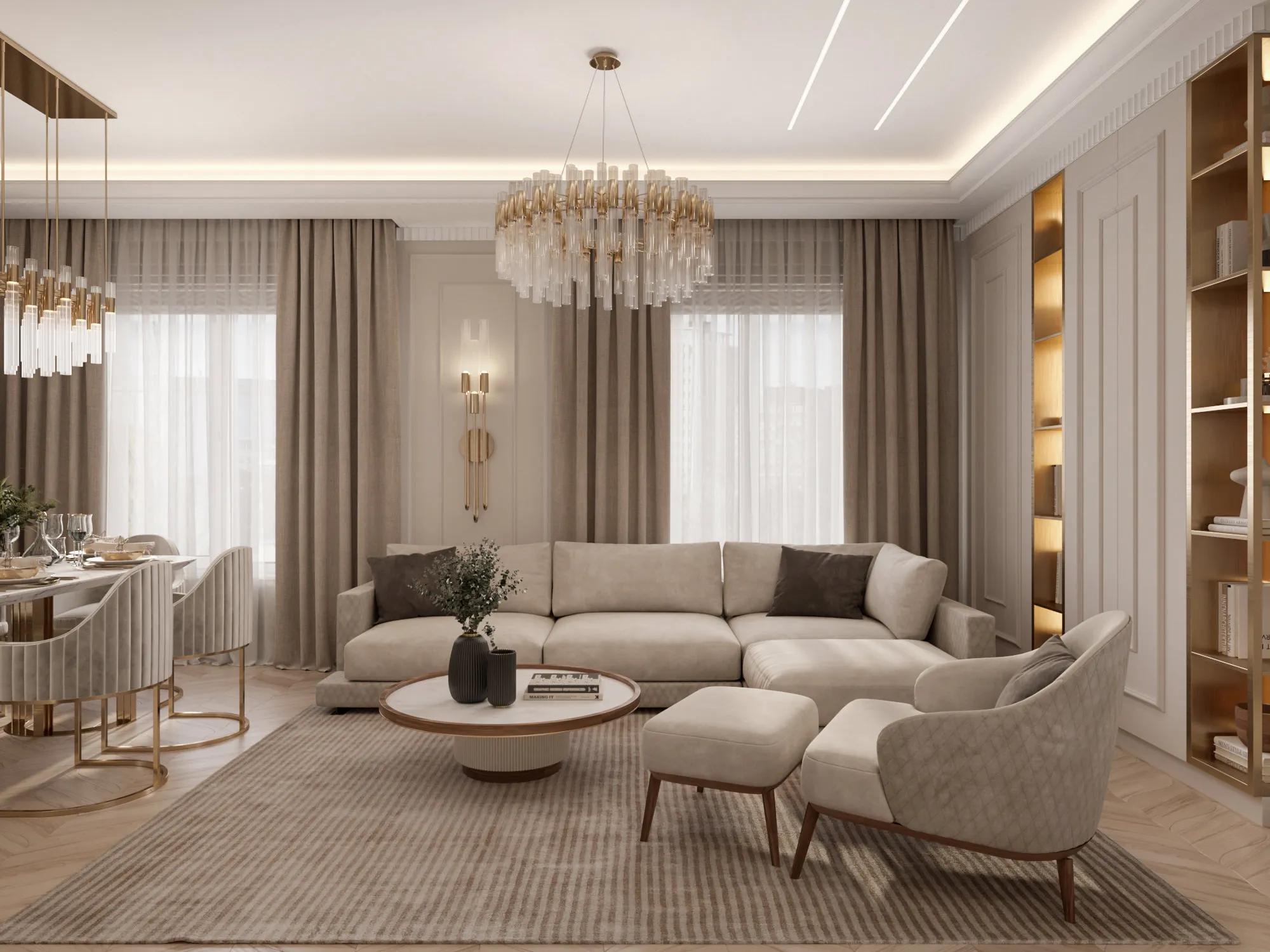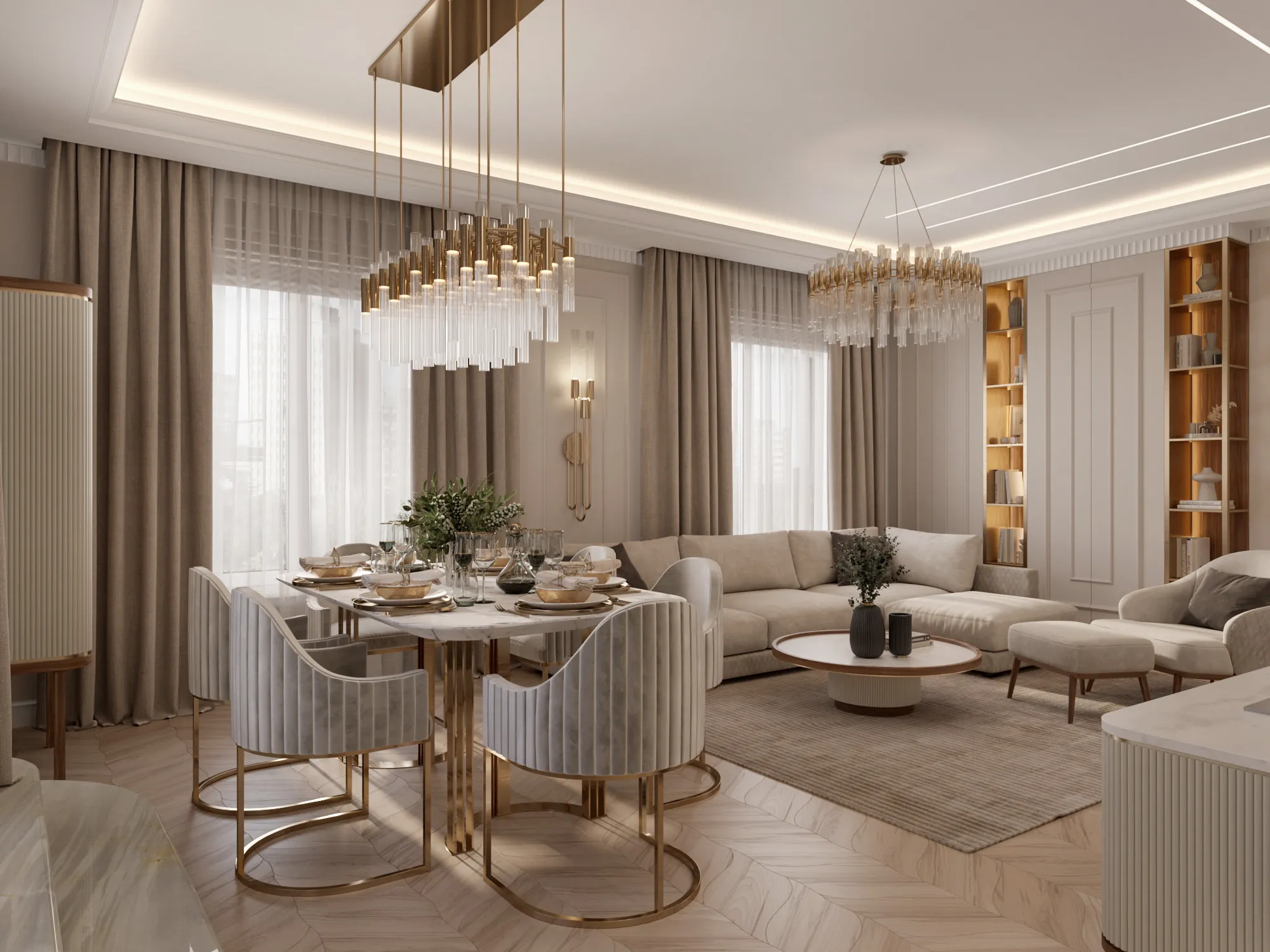 В качестве стилевого решения был выбран ар-деко, для которого свойственны строгая симметричность и геометричность. Он идеально отражает ключевую идею дизайна: сочетание четких линий, орнаментов, изгибов, современной изящной элегантности, актуальности и шика. Цветовая гамма выдержана в светлых теплых тонах с интересными акцентами – зеркалами, матовым стеклом, подсветкой. Светло-бежевая гамма в сочетании с богатыми фактурами, блеском глянцевых поверхностей, высококачественными материалами создают атмосферу, располагающую к приятному времяпровождению как в кругу семьи, так и в компании друзей.