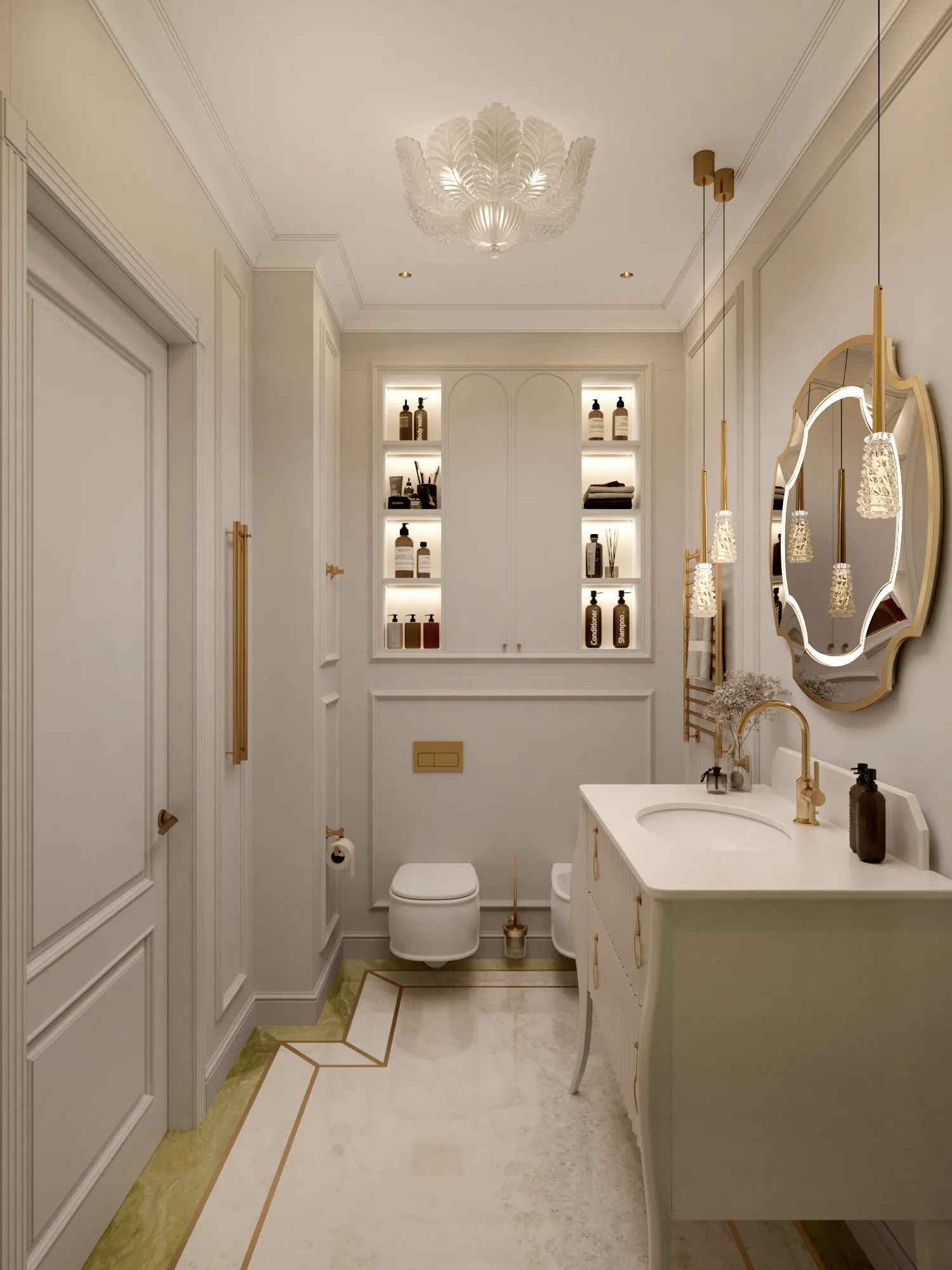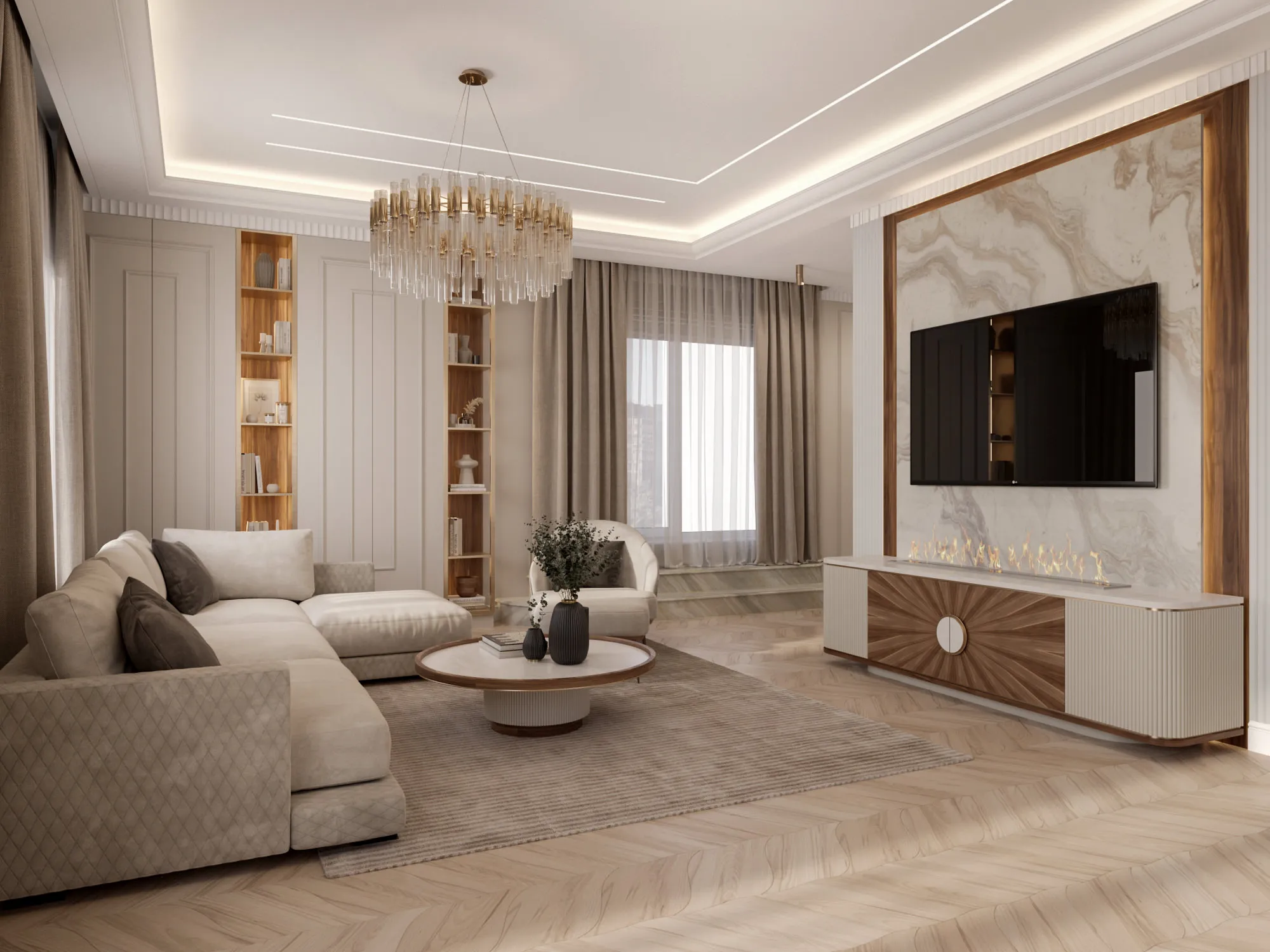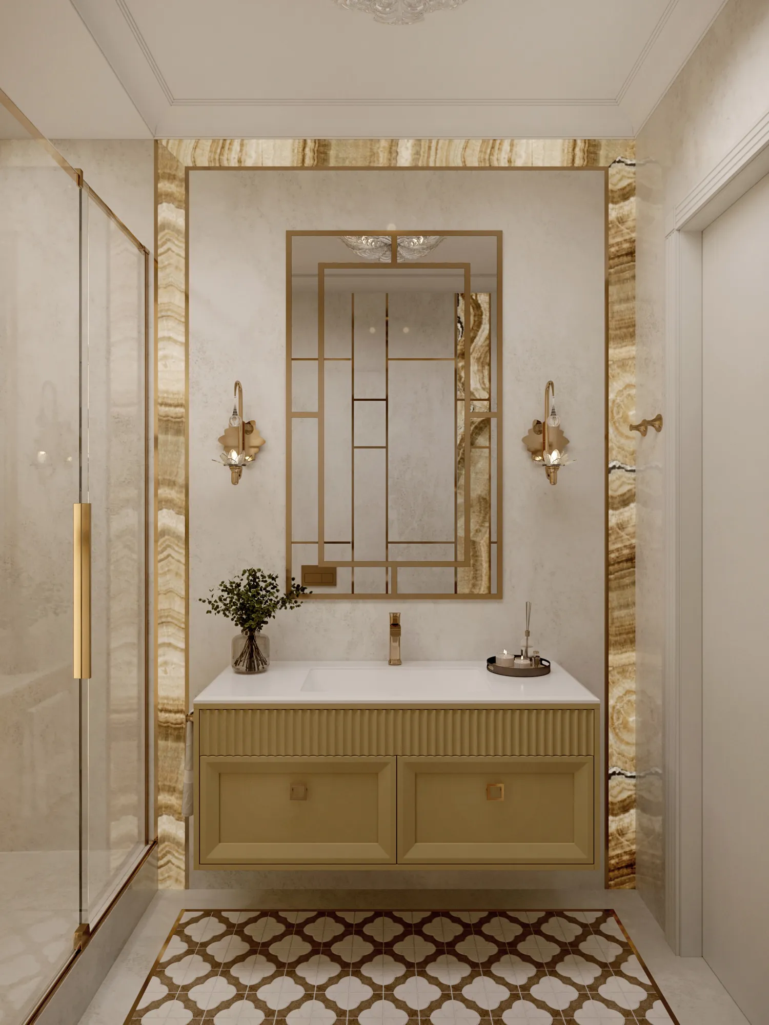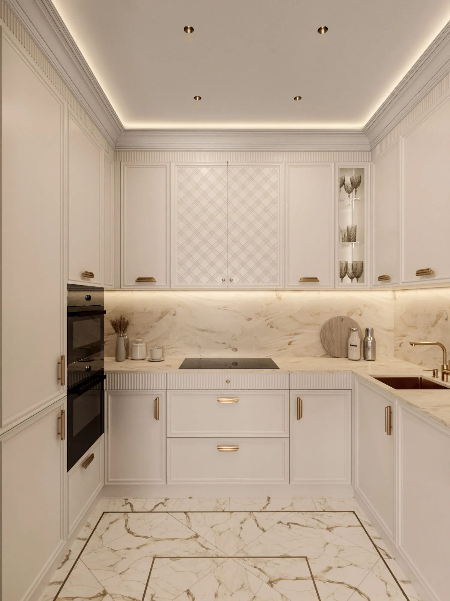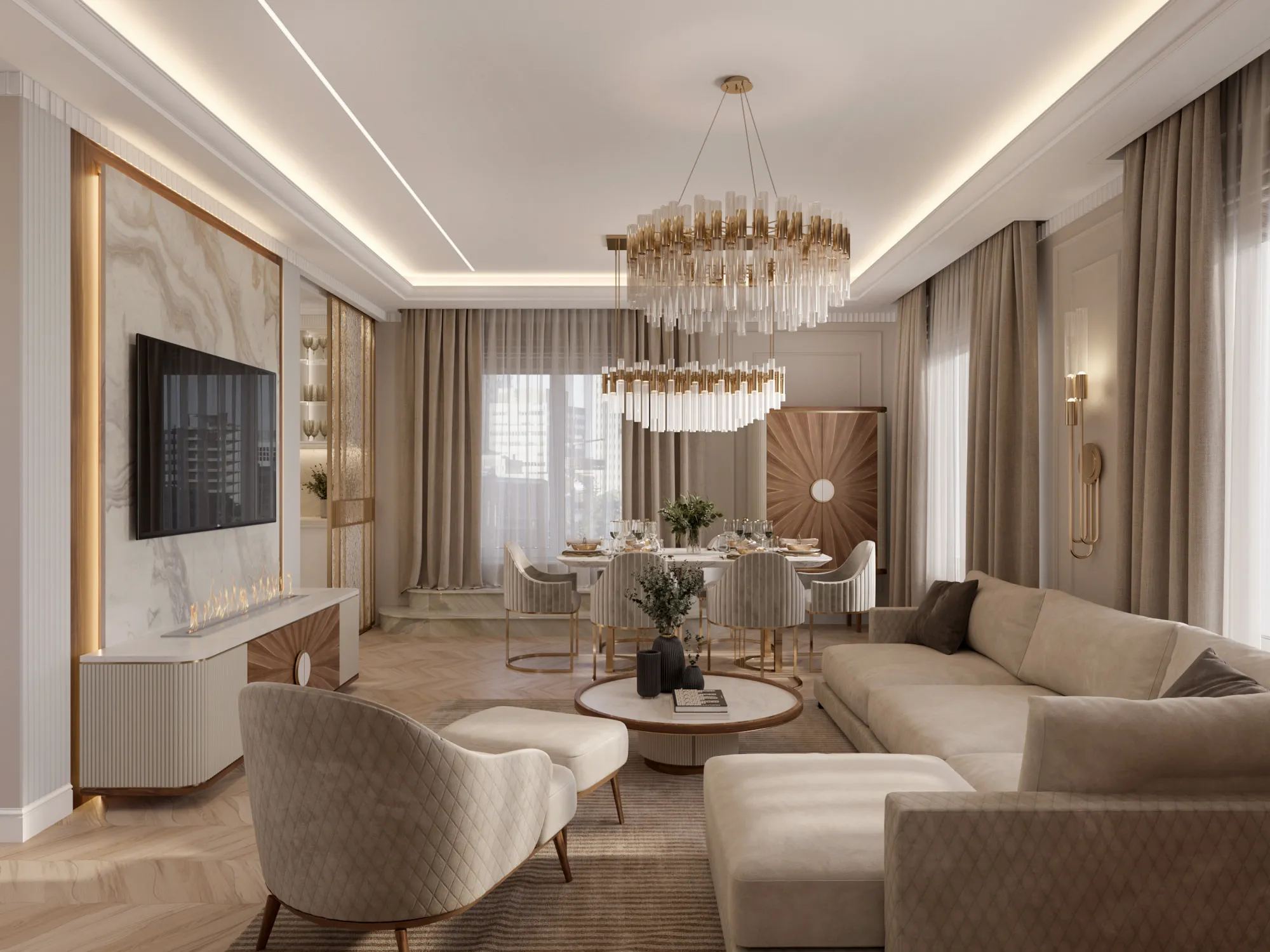 В качестве стилевого решения был выбран ар-деко, для которого свойственны строгая симметричность и геометричность. Он идеально отражает ключевую идею дизайна: сочетание четких линий, орнаментов, изгибов, современной изящной элегантности, актуальности и шика. Цветовая гамма выдержана в светлых теплых тонах с интересными акцентами – зеркалами, матовым стеклом, подсветкой. Светло-бежевая гамма в сочетании с богатыми фактурами, блеском глянцевых поверхностей, высококачественными материалами создают атмосферу, располагающую к приятному времяпровождению как в кругу семьи, так и в компании друзей.