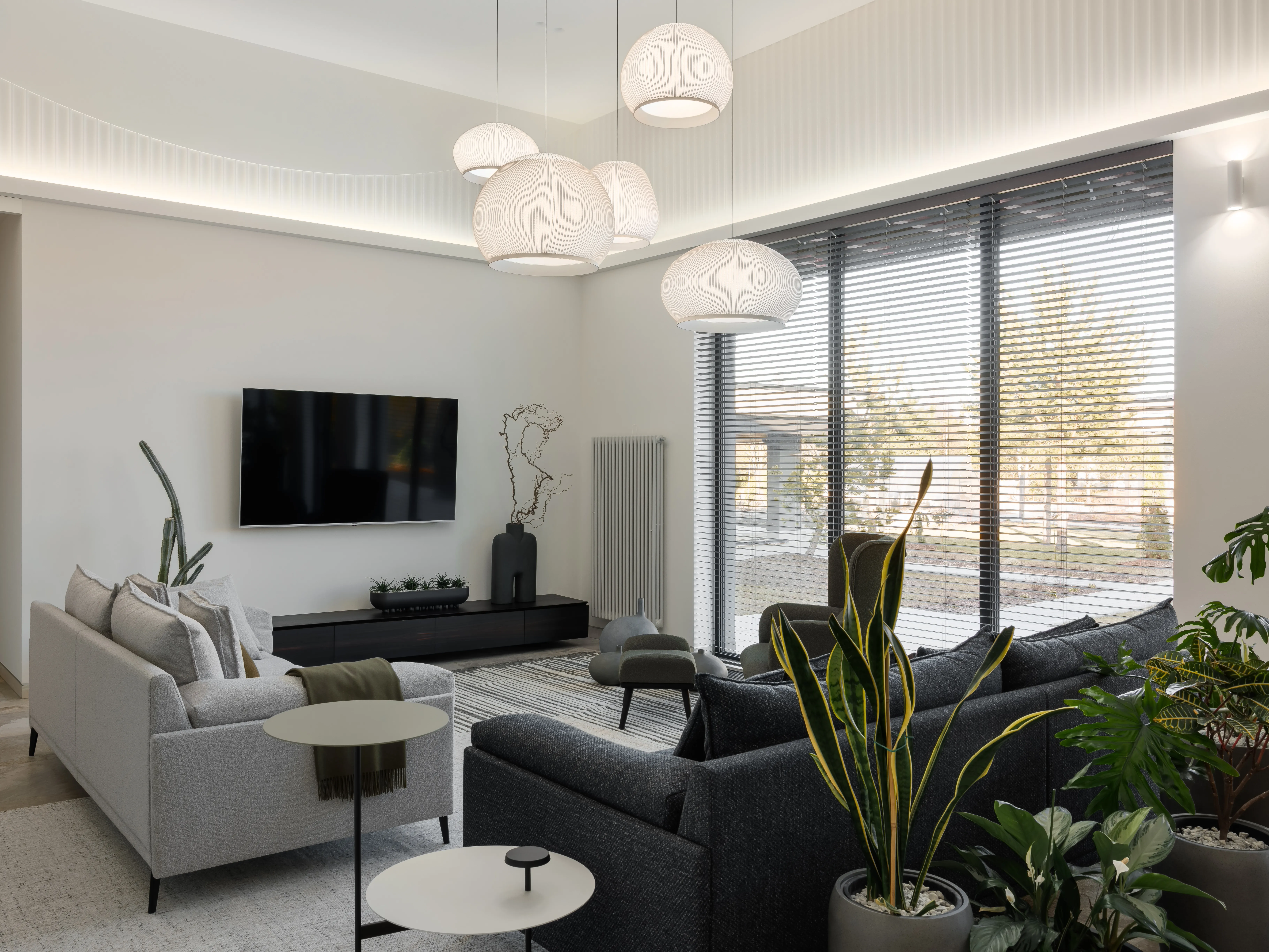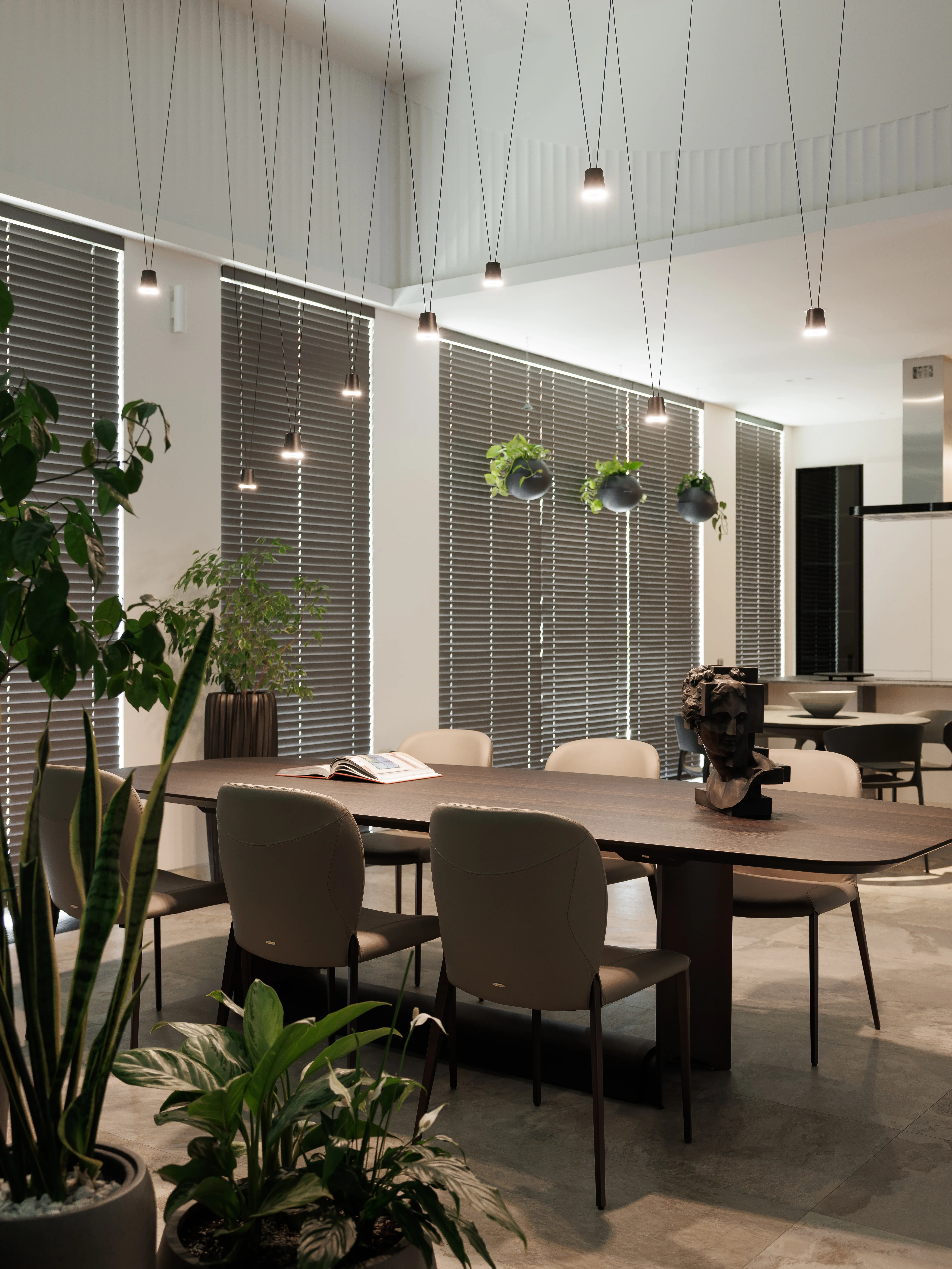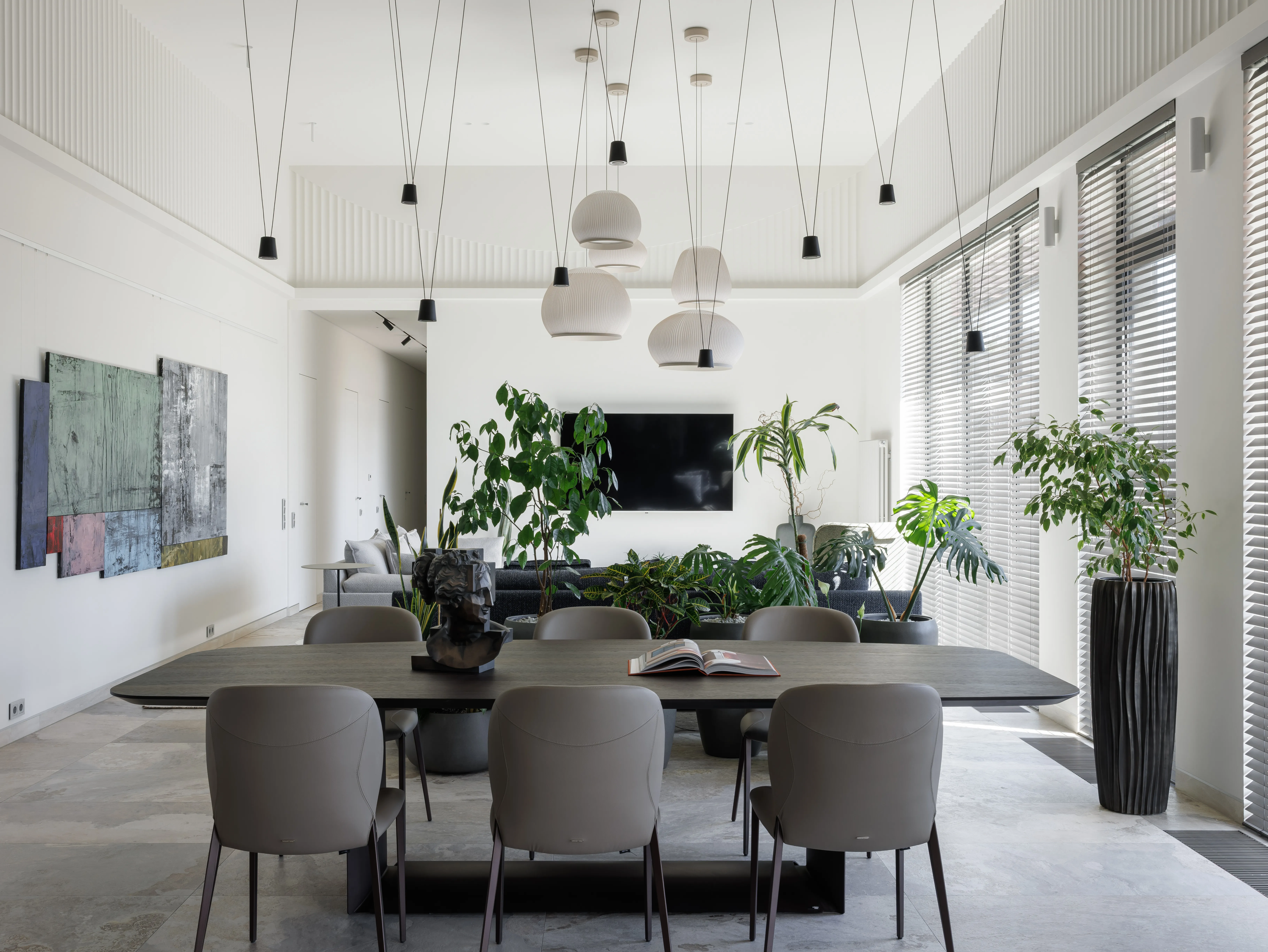 Особенности: продуманная планировка и лаконичная цветовая гамма с вкраплениями акцентных цветов. Каждая комната продуманы до мелочей и сочетает в себе функциональность и эстетику. Особое внимание уделено кухне, где из предметов мебели представлены культовые модели европейского дизайна. Огромные панорамные окна позволяют наслаждаться живописными видами на окружающий ландшафт. А растения и цветочные композиции внутри добавляют живую природу в интерьер.