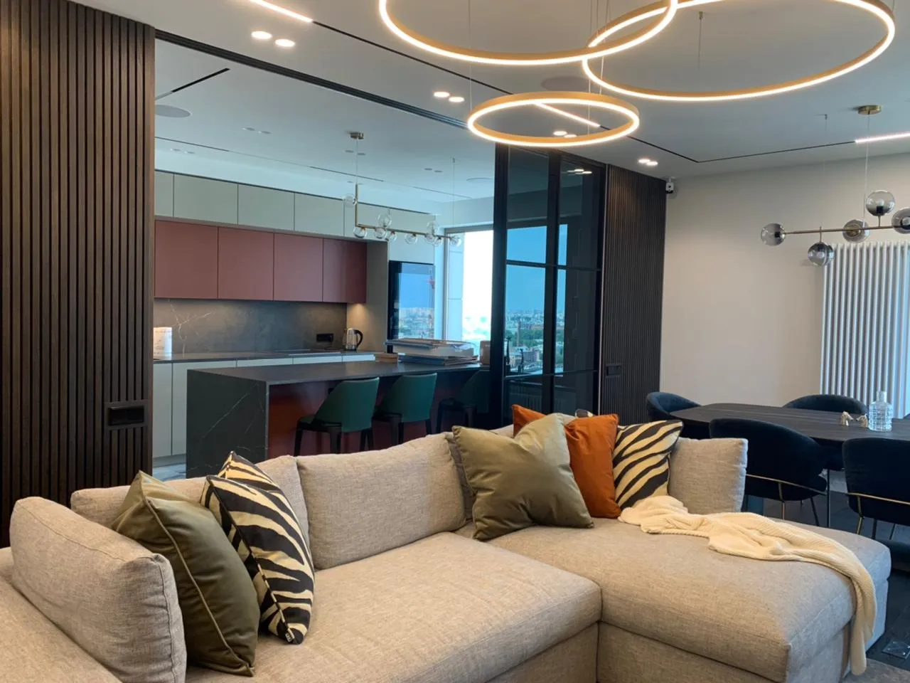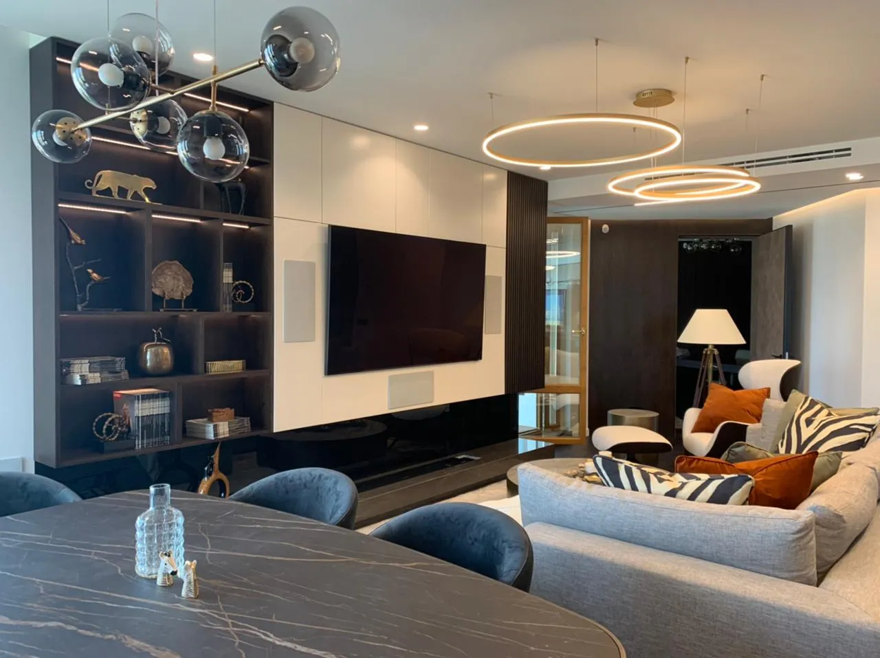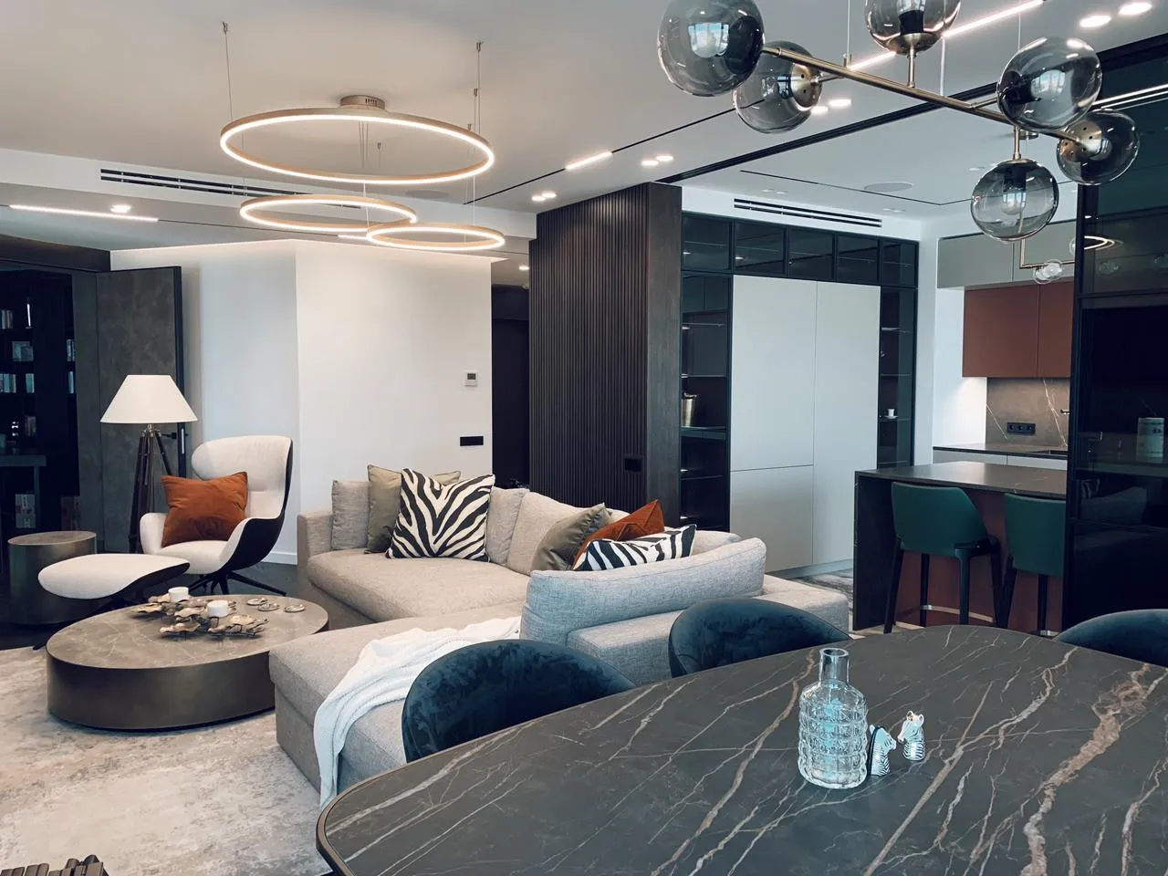 Квартира в ЖК "Монблан" с интерьером в современном стиле с использованием новейших тенденций в мире дизайнерского освещения.