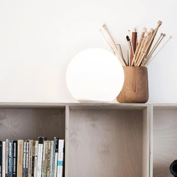 Основание лампы из белого термопластика. Диффузор в виде шара выполнен из выдувного стекла белого цвета.