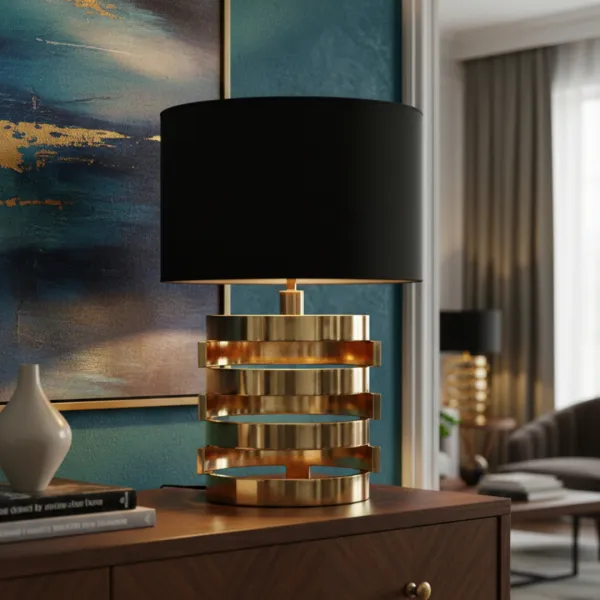Абажур овальной формы из чёрной ткани скрывает лампу.