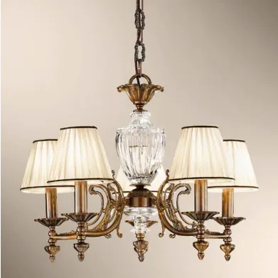 Светильник подвесной. Отделка арматуры - античная бронза с элементами хрусталя, рассеиватели - текстиль.