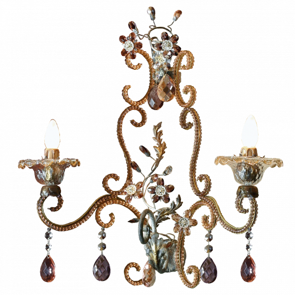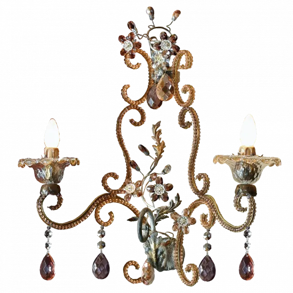 Cветильник на 2 лампы из кованого железа с прозрачным и цветным богемским хрусталем, муранским стеклом и цветным жемчугом в окантовке