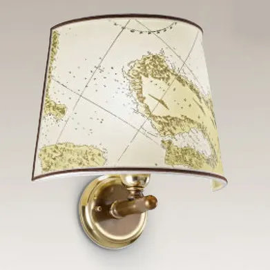 Полукруглый тканевый абажур с рисунком, изобращающем географическую карту.
