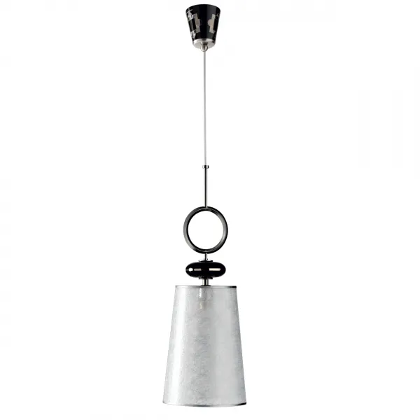 Светильник подвесной. Отделка арматуры - никель, декор - черный фарфор, рассеиватель - текстиль с эффектом пергамента.