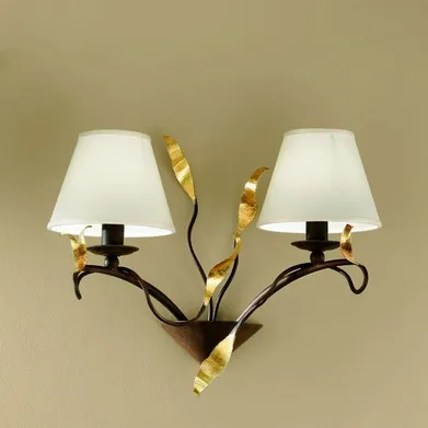 [DETAIL_TEXT] => "Бра MM Lampadari 6489/A2 V1165 XP выполнен из кованного металла. Чудесные плавно-изогнутые золотые листья дополняют конструкцию. Сквозь два белых абажура просачивается мягкий свет двух ламп средней мощности, заливая любое помещение нежным светом.