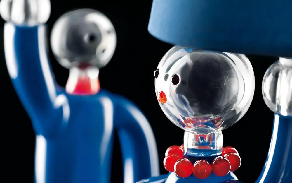Маленький синий и золотой человек с поднятой рукой, держащей лампочку и небольшой абажур. Эта лампа так и не стала коммерческим продуктом и когда Анджело вырос, светильник попал в витрины музея Barovier&Toso.