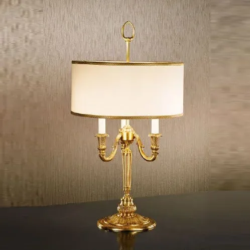 Арматура изготовлена из латуни, покрытая состаренным французским золотом. Абажур выполнен из ткани цвета слоновой кости.