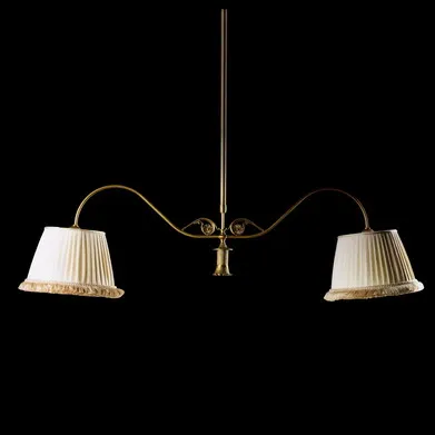 Этот изящный подвесной светильник был произведен на итальянской фабрике IL Paralume Marina. Литая конструкция изготовлена из латуни золотистого цвета. К ней прикреплены изящные аксессуары, которые придают светильнику изящность. Особую элегантность ему придают два рифленых абажура светлого цвета. По нижнему краю абажуры обрамлены легкой оборочкой из шелка. "