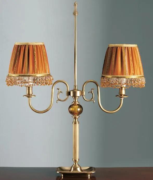 Изящная стойка и держатели для абажуров изготовлены из состаренного золота. Стойка декорирована шарообразной вставкой из муранского стекла янтарного цвета. Прекрасные шелковые абажуры выполнены в ярком рыжем цвете и дополнены свисающими подвесками с бусинками. Эта прелесть произведена на итальянской фабрике IL Paralume Marina. "