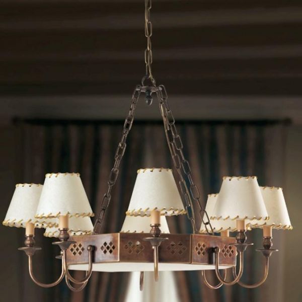 Эта люстра с тяжелой конструкцией. Она изготовлена из бронзы. Чуточки мягкости ей придают нежные светленькие абажуры, которые выполнены из натурального высококачественного шелка. Эта люстра произведена на итальянской фабрике IL Paralume Marina. Она станет великолепной находкой для настоящих эстетов.