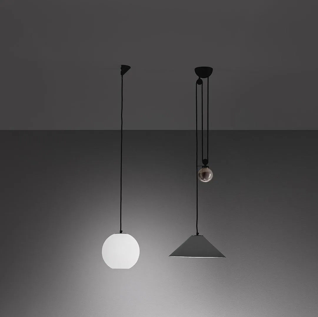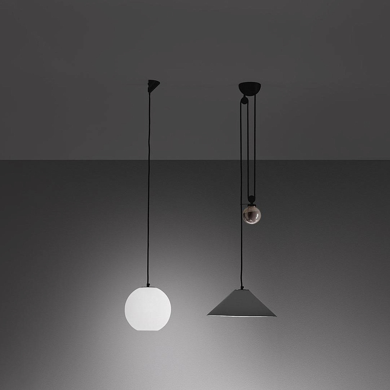 Aggregato - это результат размышлений дизайнера Энцо Мари о логике промышленного производства: несколько базовых элементов позволяют объединить множество световых решений; это системная и строго продуманная идея для освещения всех помещений. Три различных диффузора двух размеров можно комбинировать с простой подвесной конструкцией или с системой Saliscendi a Sfera. Потолочная чашка выполнена из термопластика, рассеиватель из метакрилата.