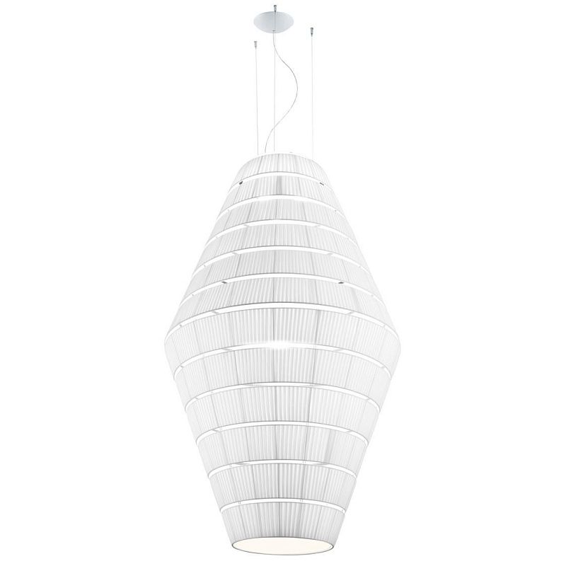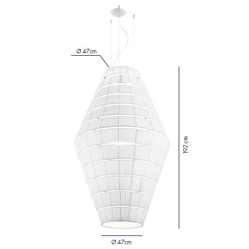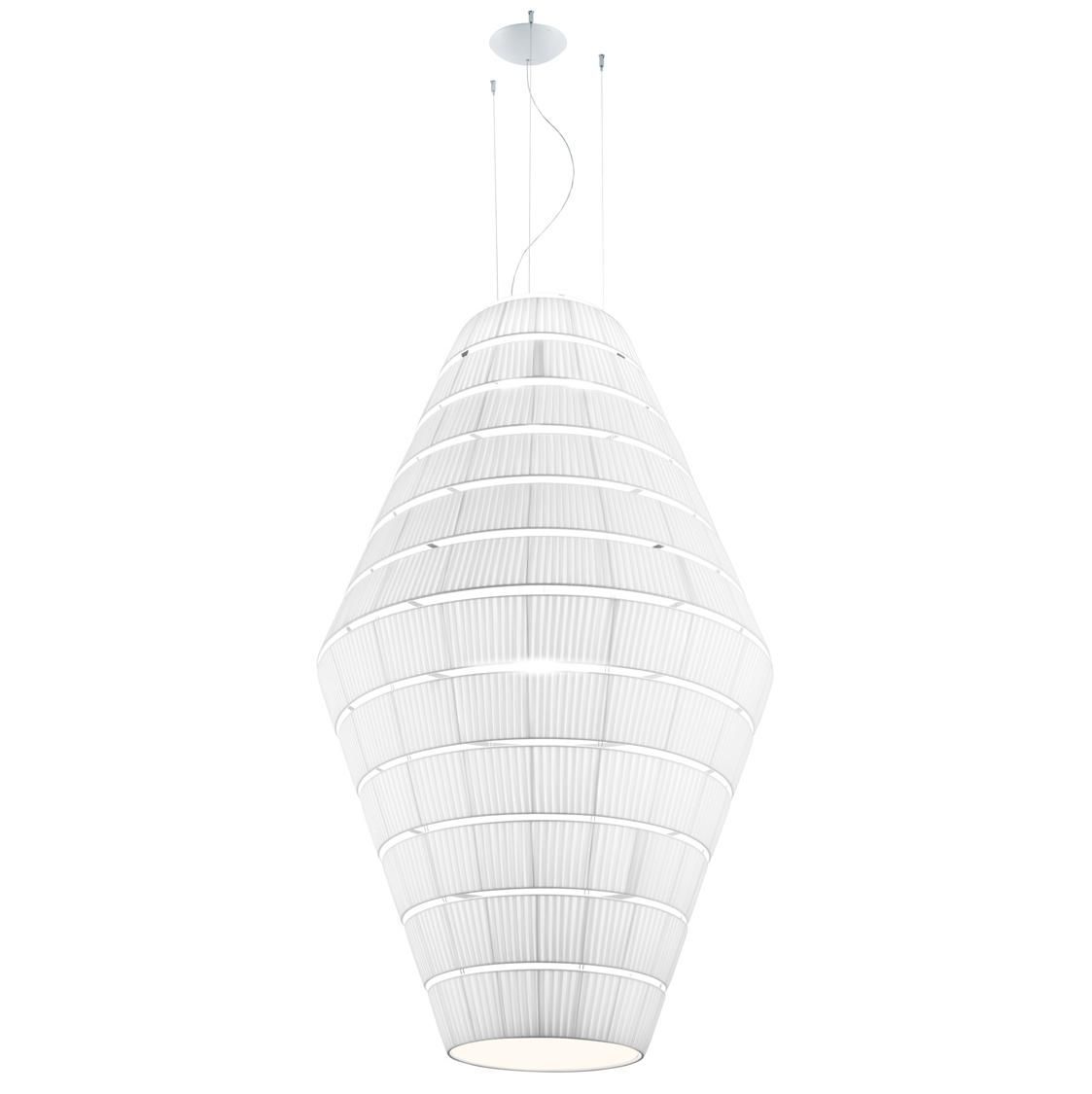 Коллекция потолочных и подвесных светильников с металлическим каркасом, покрытым полосками из очень гладкой огнеупорной ткани Ponge.