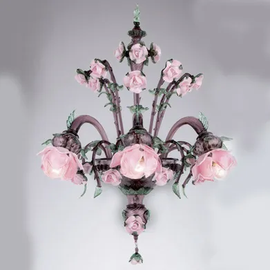 Декор бра выполнен в виде цветов розового цвета и зеленых листьев.