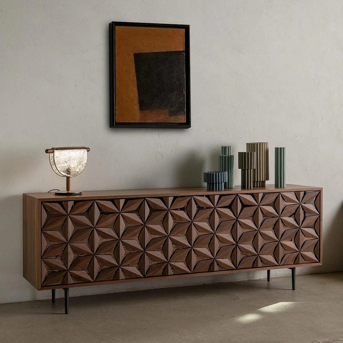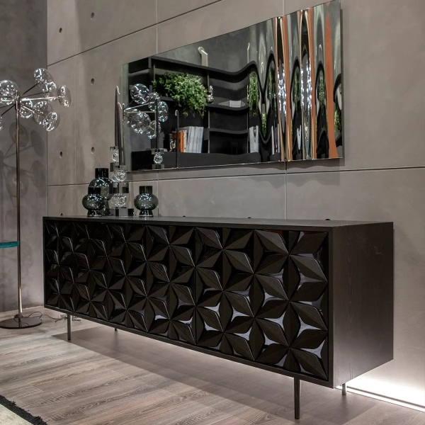 Комод All Star сочетает в себе свой неповторимый внешний вид с драгоценным созвездием лепестков ручной работы из массива дерева, которые покрывают дверцы с зеркальными основаниями, создавая уникальный элемент дизайна и высокое мастерство исполнения.