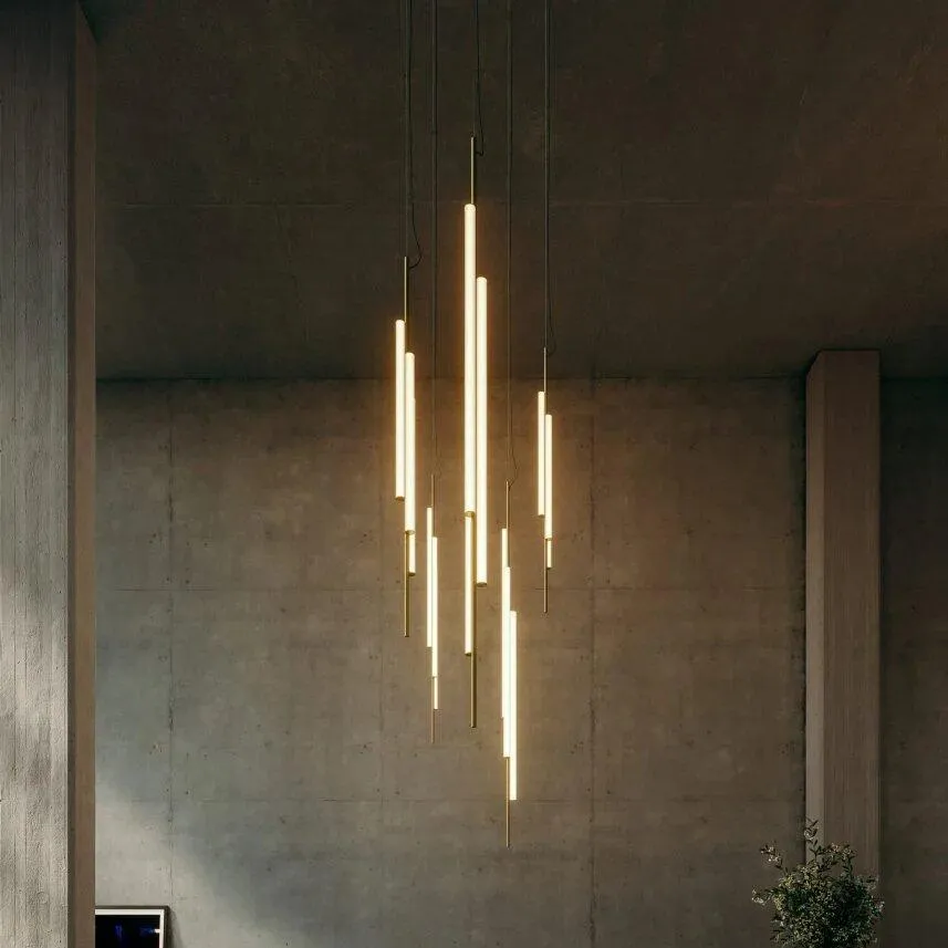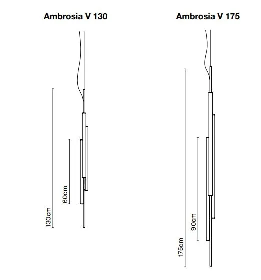 Другая вертикальная версия, Ambrosia V3 , объединяет три световые трубки, расположенные на разной высоте, образуя скульптурный ансамбль. Эта опция обеспечивает большое количество света и, следовательно, оснащена системой регулировки яркости для удобства управления освещением. Он доступен в двух вариантах высоты - 130 и 175 см. Оба размера могут быть электрически подключены с помощью потолочной розетки или напольной розетки.