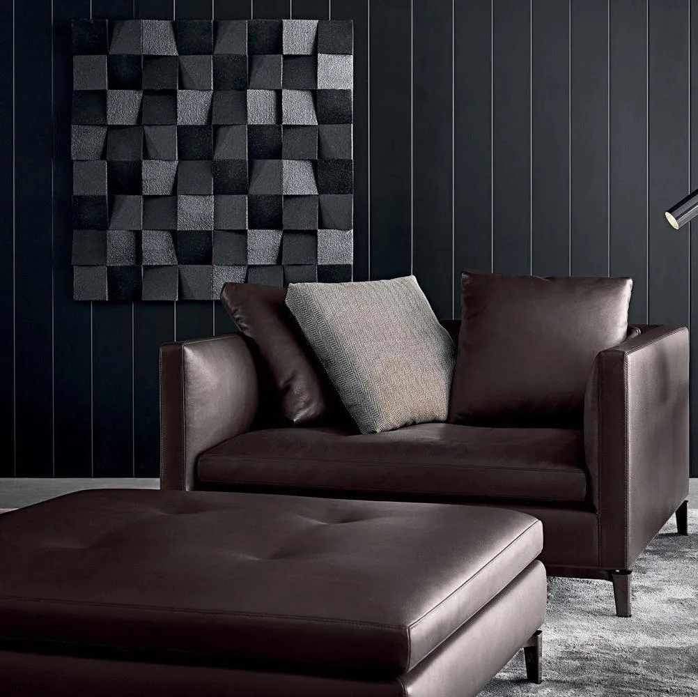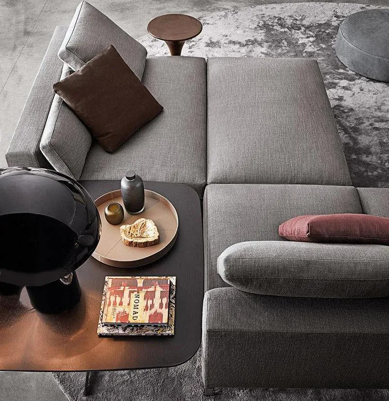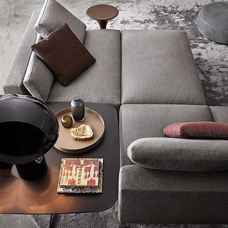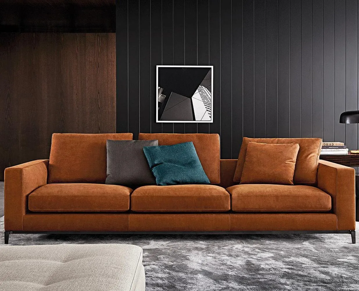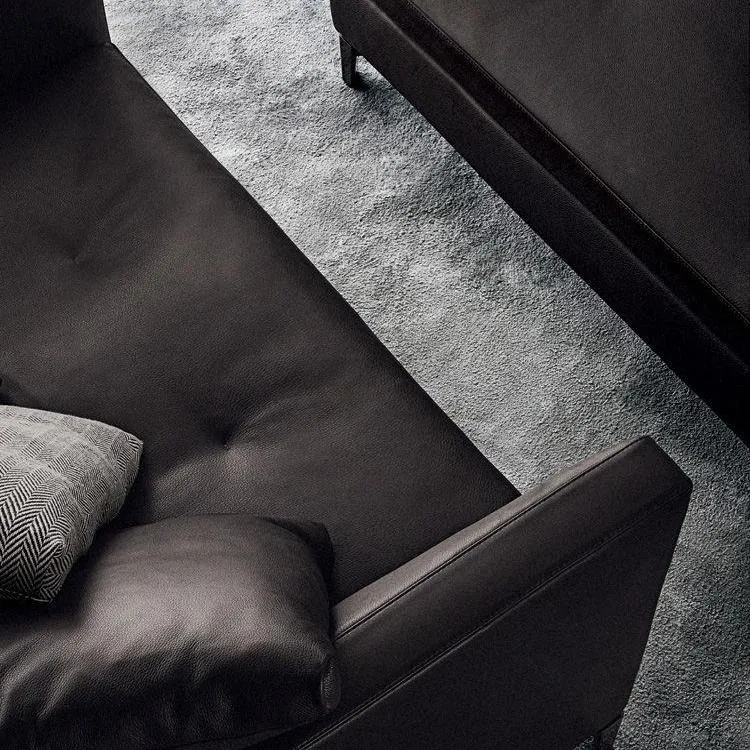 Диван Andersen как будто парит над полом на тонком металлическом основании, отлитом под давлением, и элегантных ножках, окрашенных в оловянный цвет, эксклюзивного оттенка Minotti Studio .