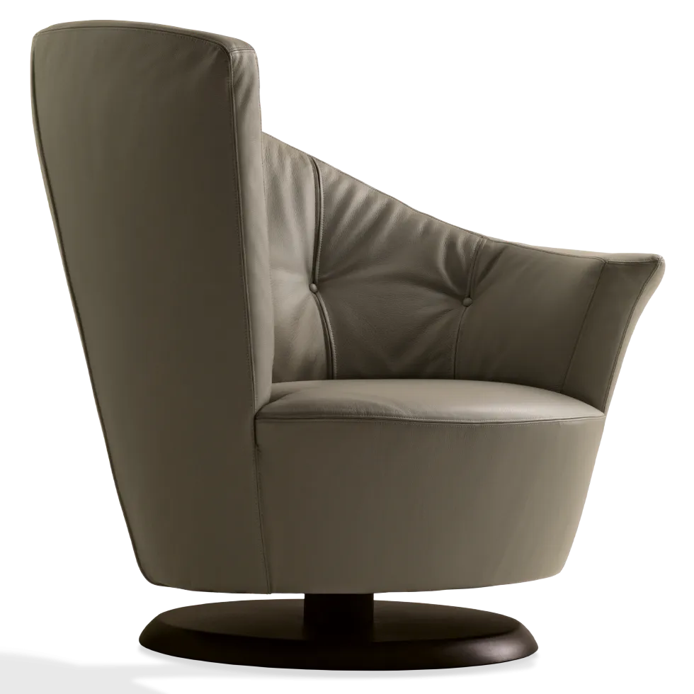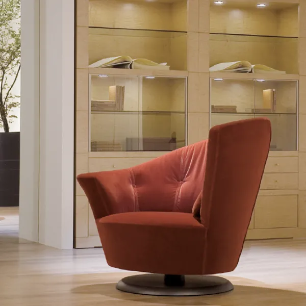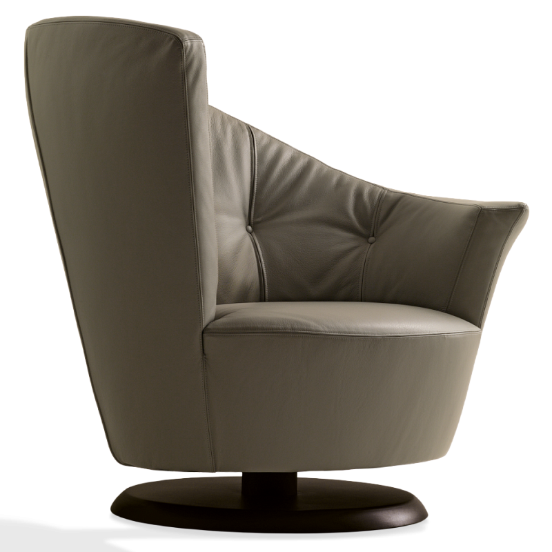 Вращающееся кресло доступно с правым или левым подлокотником и основанием, покрытым лаком бронзового цвета. Каркас выполнен из многослойного дерева тополь.