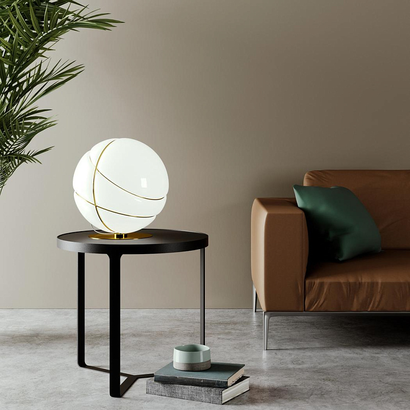 Рассеиватель изготовлен из глянцевого белого стекла, выдуваемого в круглую форму, в которую вставлены металлические кольца и аккуратно закреплены на месте с помощью расплавленного стекла в конце процесса. Кольца имеют полированную поверхность с золотым и хромированным покрытием.