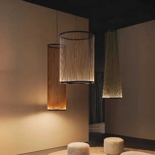 Подвесной светильник Array включает в себя серию технических нитей, которые туго натянуты между двумя кольцами, через которые свет поднимается, создавая цветовой градиент. Цилиндрическая форма и компактные размеры делают его идеальным для небольших помещений.