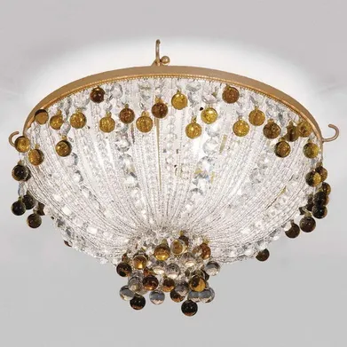 Круглые хрустальные подвески прозрачного и янтарного цвета.