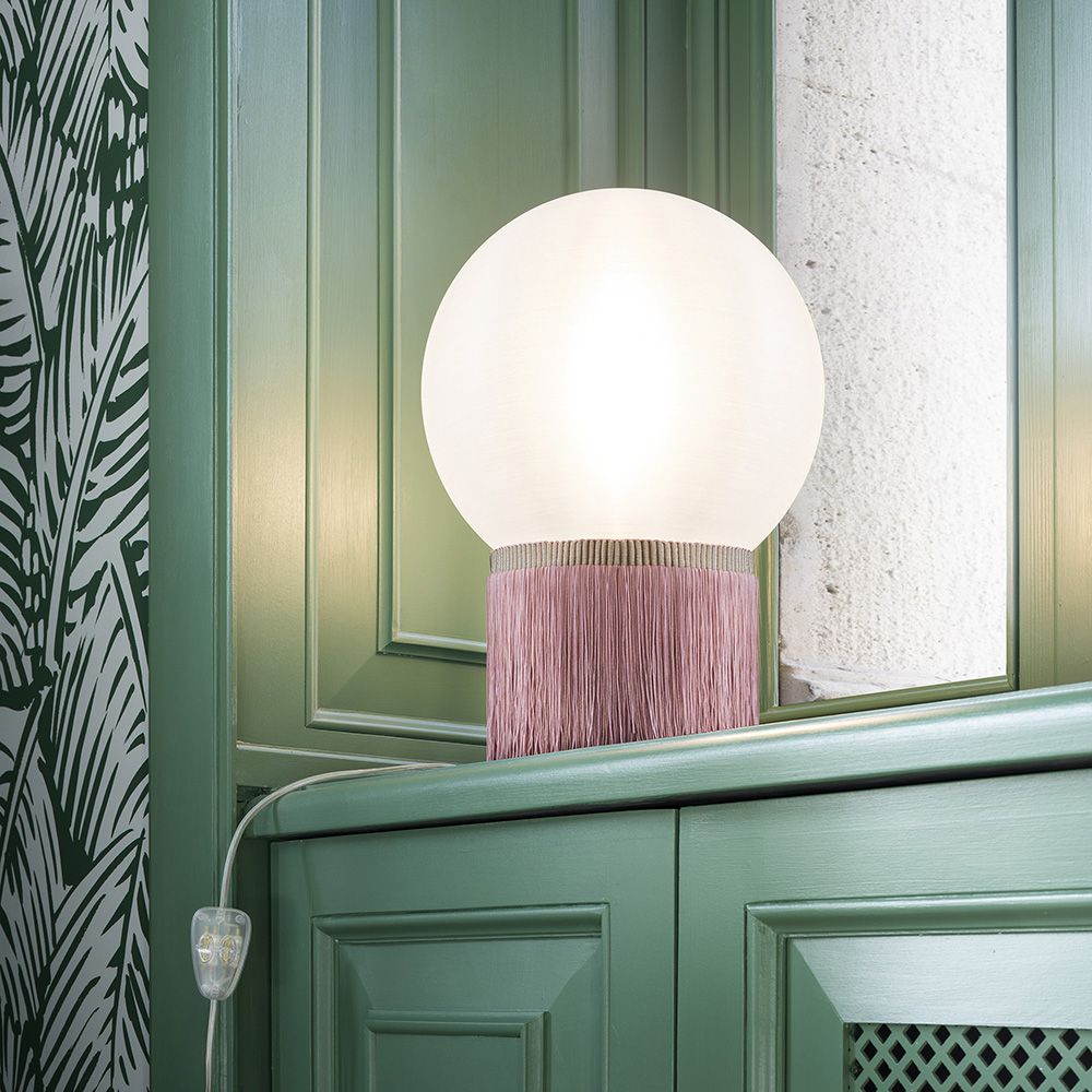Бахрома, напоминающая платье девушек, танцующих чарльстон, украшает цилиндрическую основу светильника Atmosfera Fringe . Вершину конструкции венчает сфера ручной работы, которая испускает мягкое свечение. Лампа управляется простым переключателем, что весьма удобно.