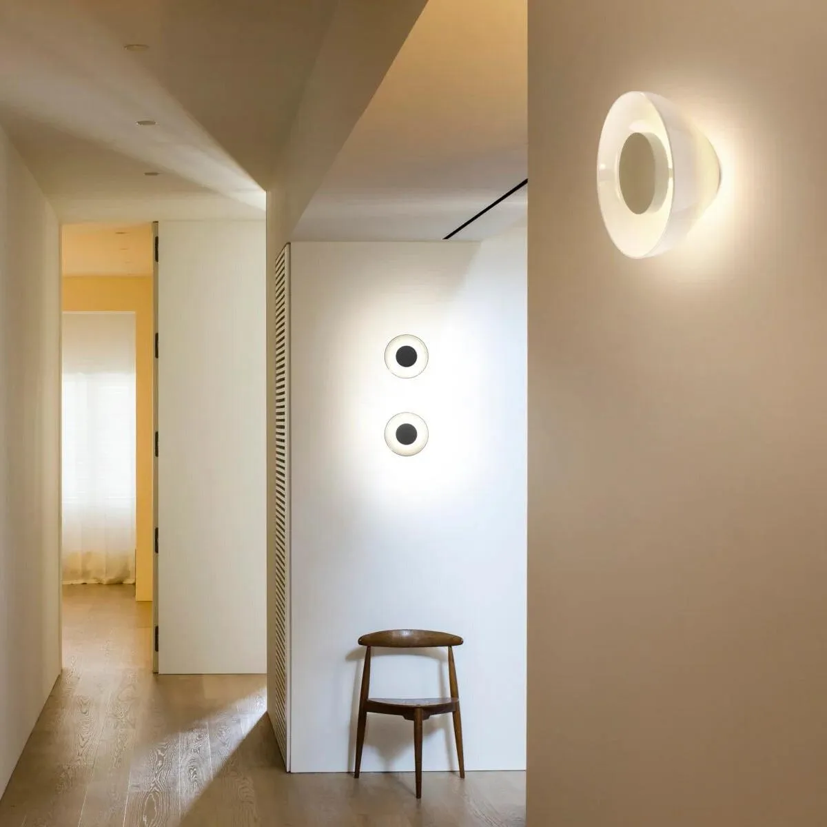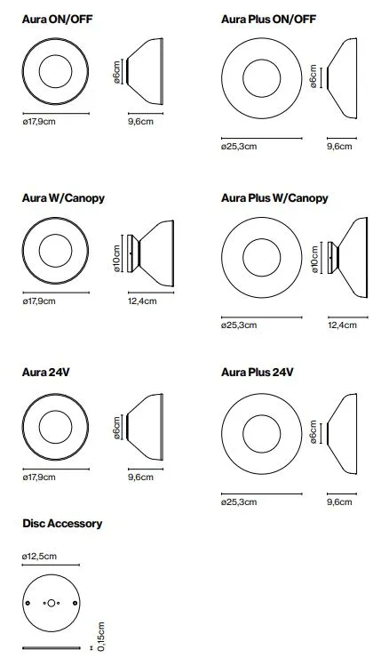 Aura выпускается в двух размерах – 18 и 25 см в диаметре – для создания световых решений для небольших или больших помещений. Этот легкий и мощный настенный светильник должен идеально сочетаться с интерьером, который он должен освещать, и пропорция всегда зависит от масштаба.