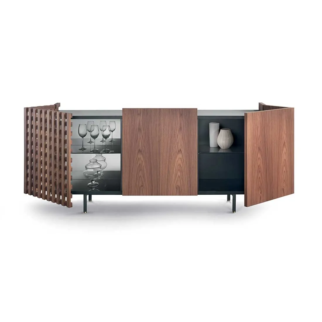 Комод с внутренней структурой, покрытый черным матовым лаком с закрытыми порами. Двери, облицованные шпоном из массива ореха каналетто, с угловым отверстием (только для боковых дверей). Внутренние полки из прозрачного стекла. Металлическое основание, окрашенное в графитовый цвет, и латунные детали. По запросу - столешница и/или задняя часть зеркала из бронзы.