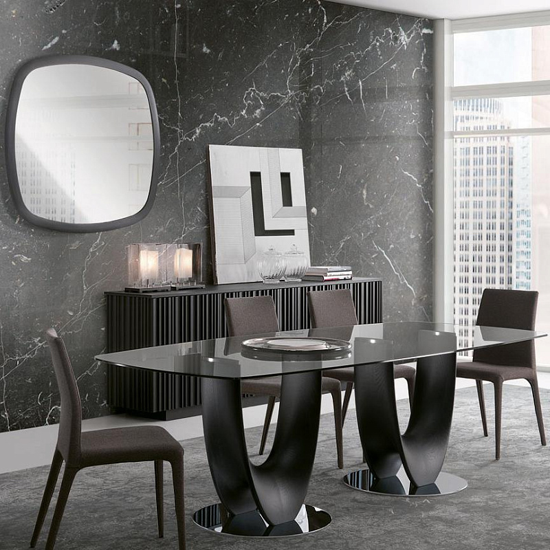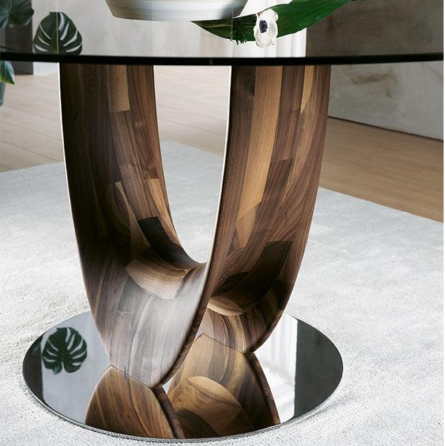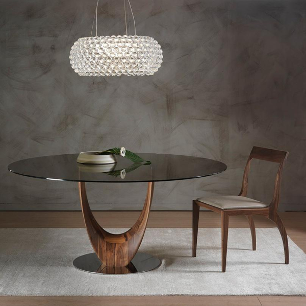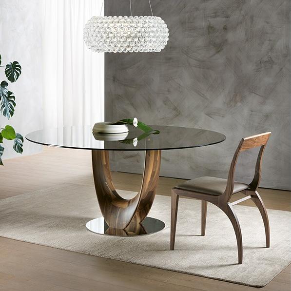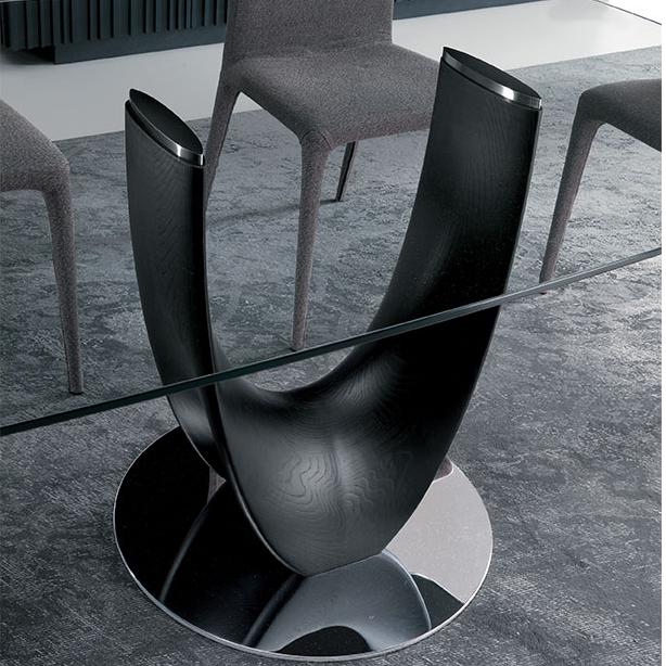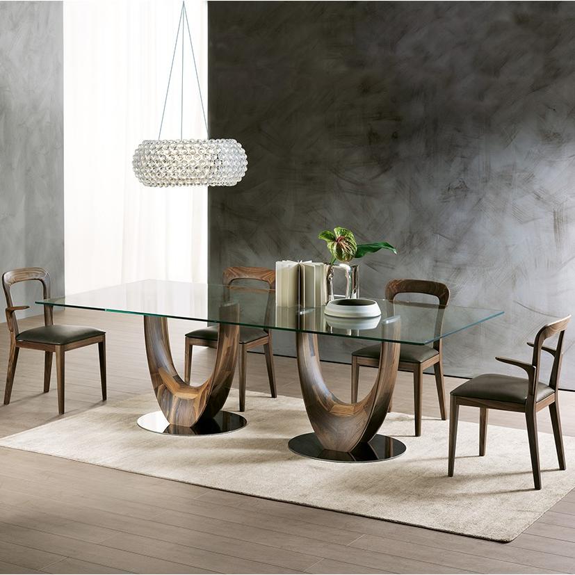 Обеденный стол из массива ореха каналетто или ясеня. Основание из хромированного металла или металла, окрашенного в титановый цвет. Столешница из закаленной прозрачной бронзы или дымчатого стекла толщиной 10 или 12 мм с электросварными опорами, шпонированного ясеня или ореха каналетто, а также из полированного натурального мрамора.