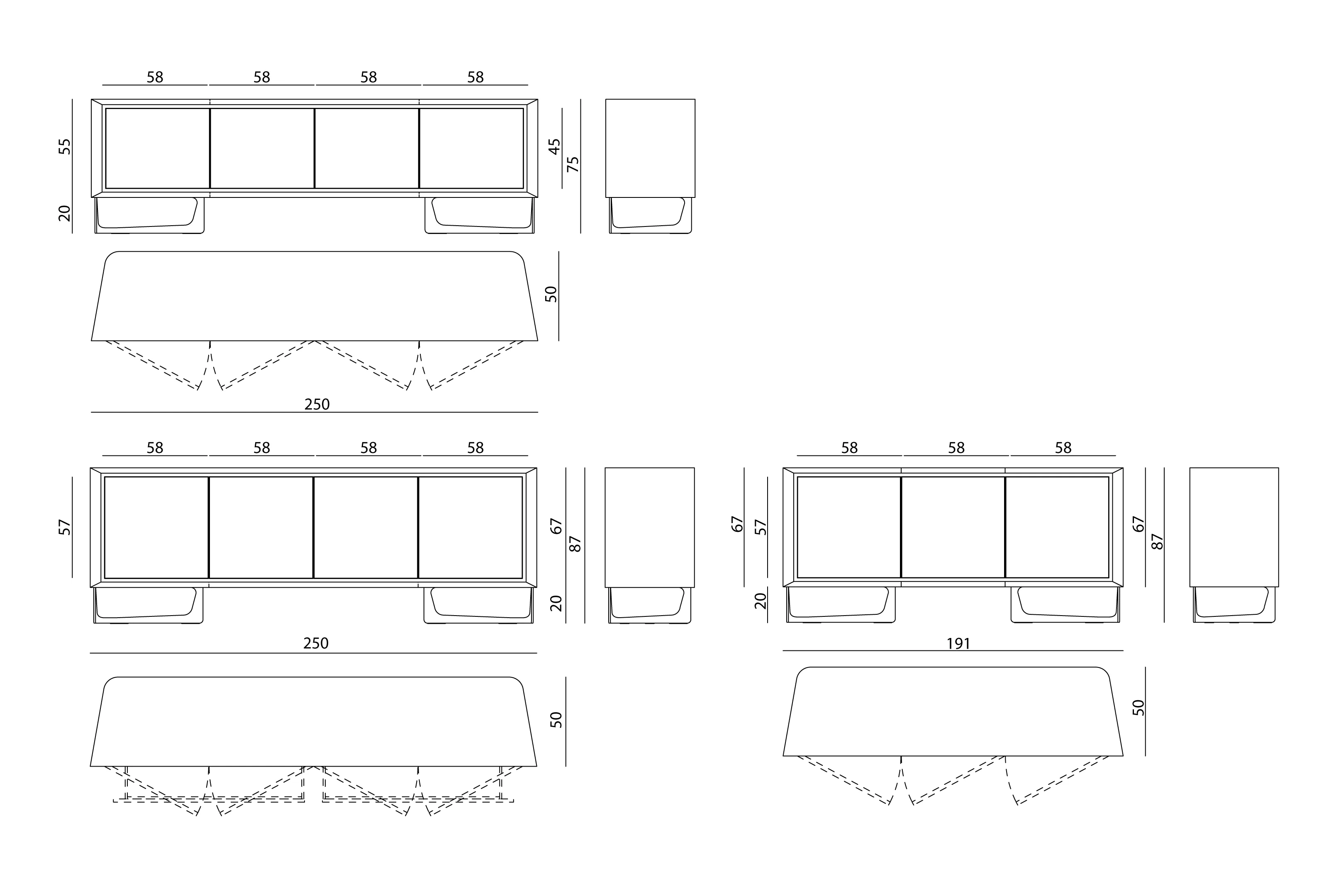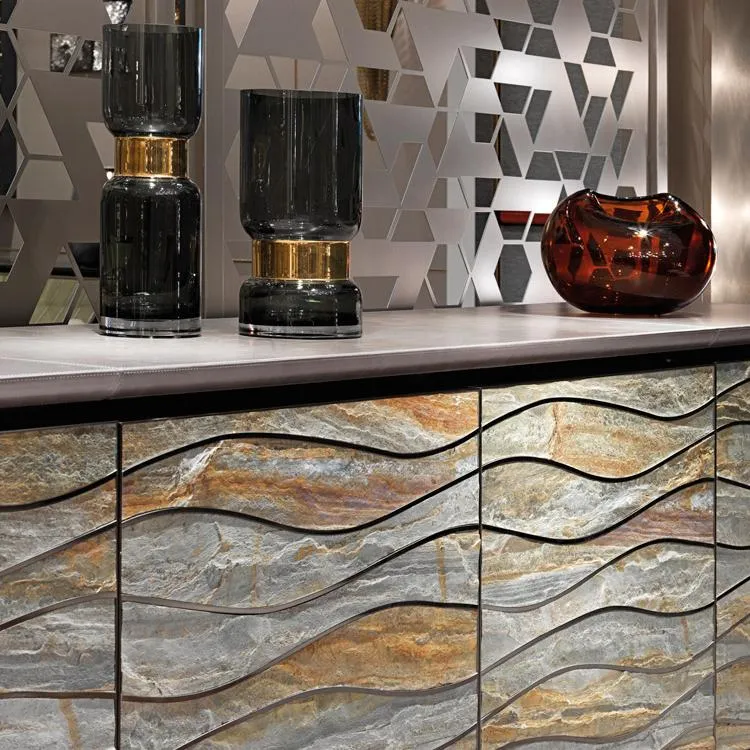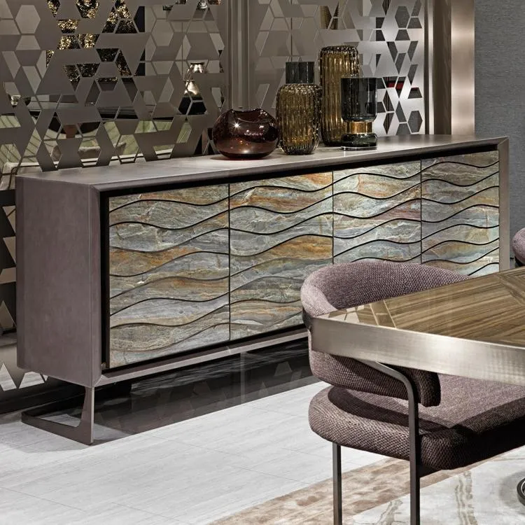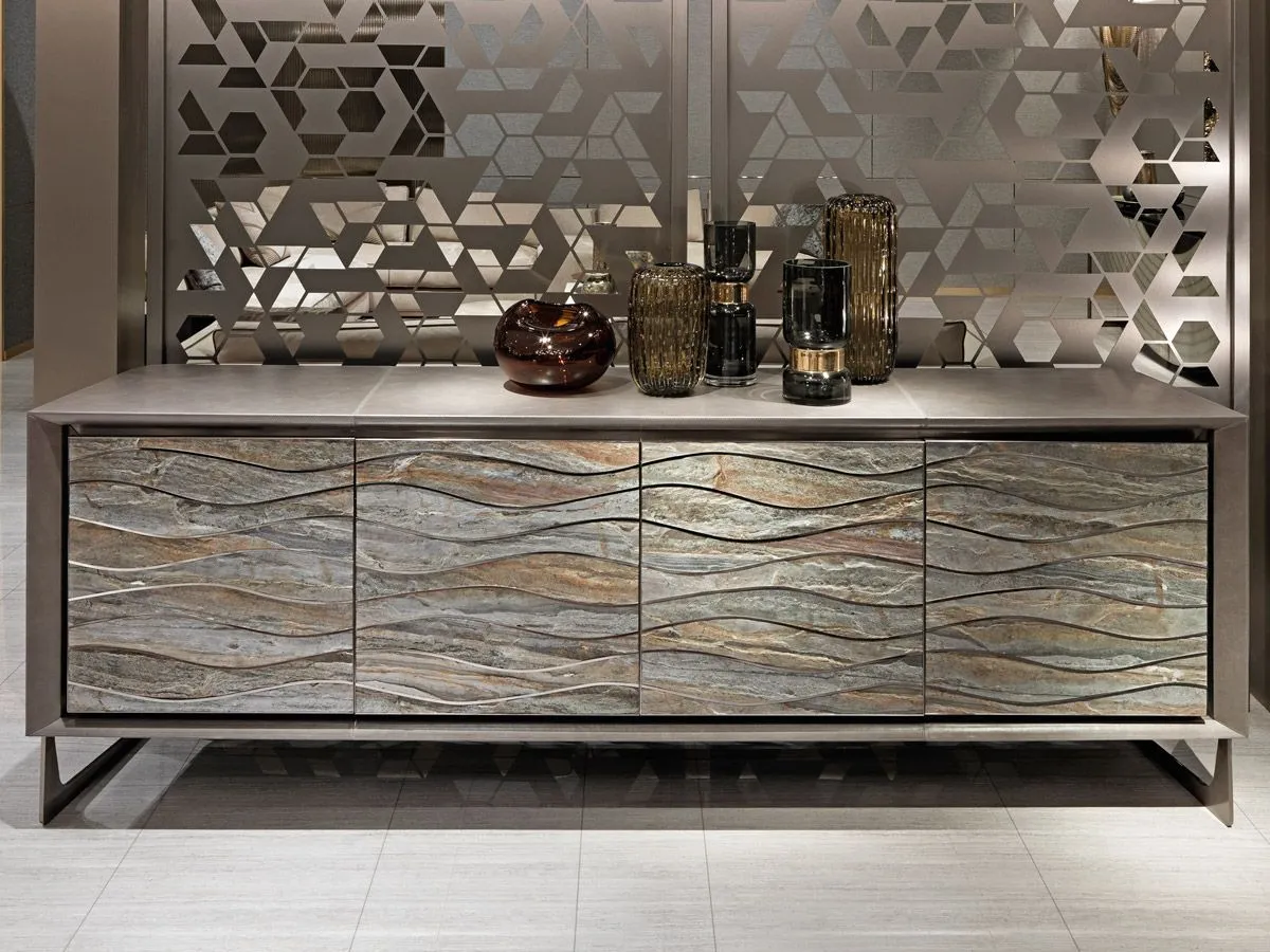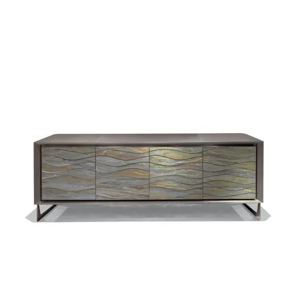 Конструкция комода из фанеры с 4 дверцами и 2 внутренними выдвижными ящиками, обтянутая кожей или лакированным деревом. Дверные пазы и рамы из сатинированной нержавеющей стали, передние декоративные панели из натурального камня с вставками из блестящей нержавеющей стали. Ножки из сатинированной нержавеющей стали. Металлические детали доступны в вариантах отделки сатинированным металлом. Также доступен низкий комод с 4 дверцами без внутренних выдвижных ящиков.