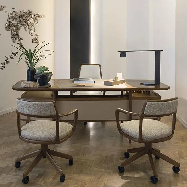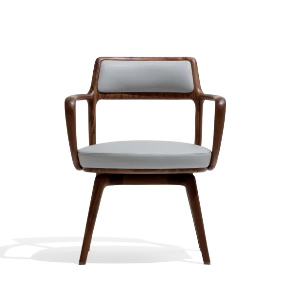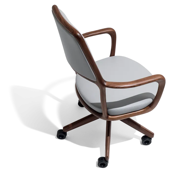 Небольшое кресло может быть стационарным или с поворотным сиденьем и выпускается в двух вариантах исполнения: с четырьмя ножками, с металлическими вставками, окрашенными в бронзовый цвет с естественным эффектом, или с 5-точечным поворотным основанием с вращающимися колесиками и пружиной для регулировки высоты