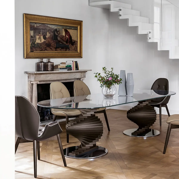 Главная особенность стола Big Firenze заключается в его основании: оно изготовлено из цельных планок ореха Каналетто или темного дуба. Планки соединены одна за другой, образуя спиральную скульптуру, которая создает элегантную оптическую иллюзию.