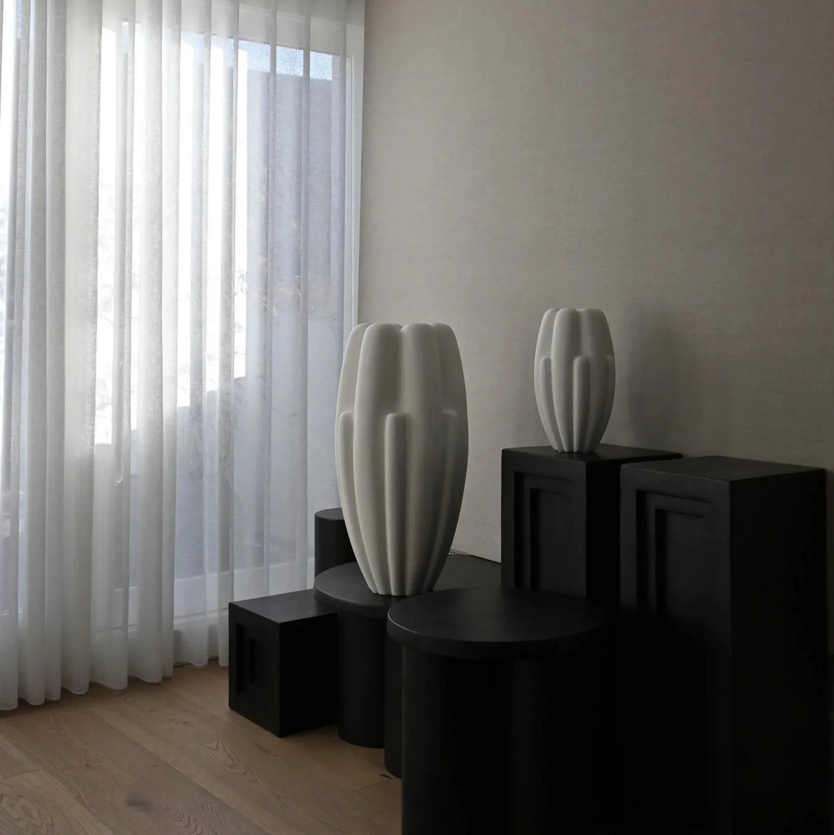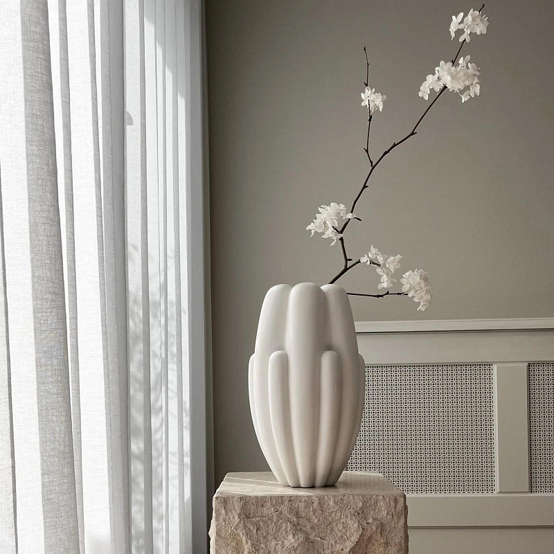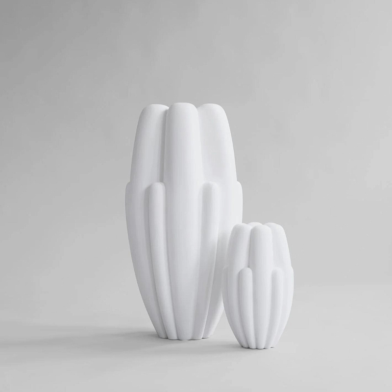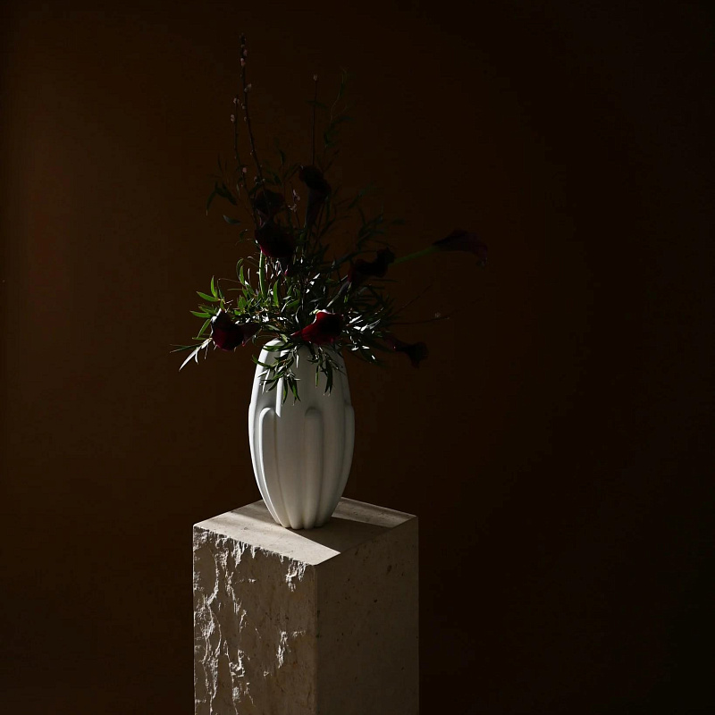 Bloom - это интерпретация цветочного дизайна, вдохновленного 70-ми годами, но с более грубой и чистой выразительностью. Плавно изогнутая поверхность контрастирует с четкой геометрией, лежащей в основе, и дополняется красивой игрой теней в глубине поверхности. Благодаря своему выразительному дизайну, вазы для цветов меняют внешний вид в течение дня в зависимости от расположения света и теней.