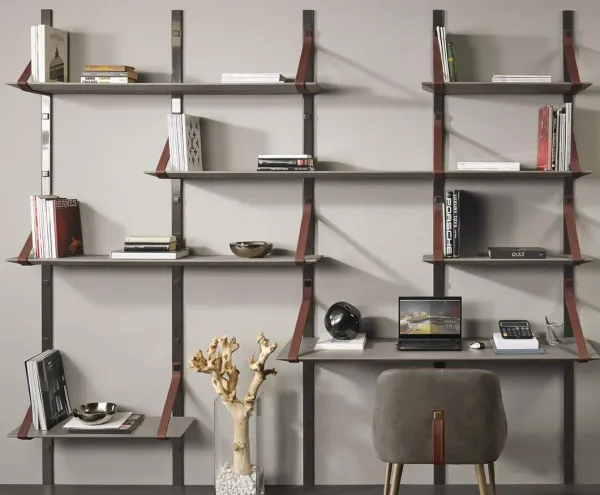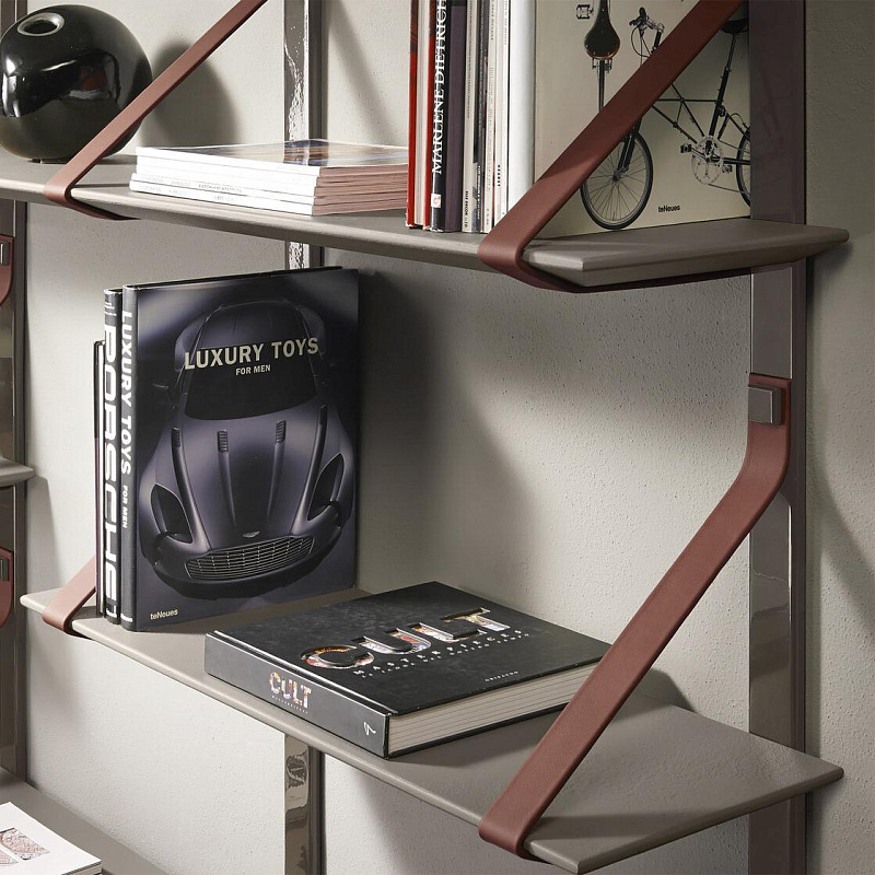 Полки могут быть отшлифованы в четырех различных оттенках с новым эффектом цемента или выполнены из шпонированного черного дерева. Полки украшены элегантными кожаными ремешками, которые застегиваются на пуговицу в тон каркасу.