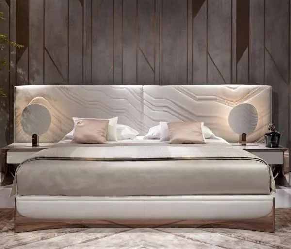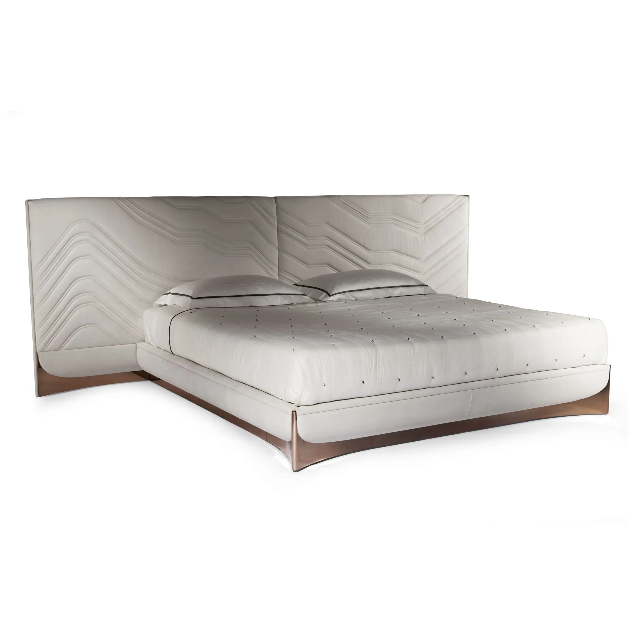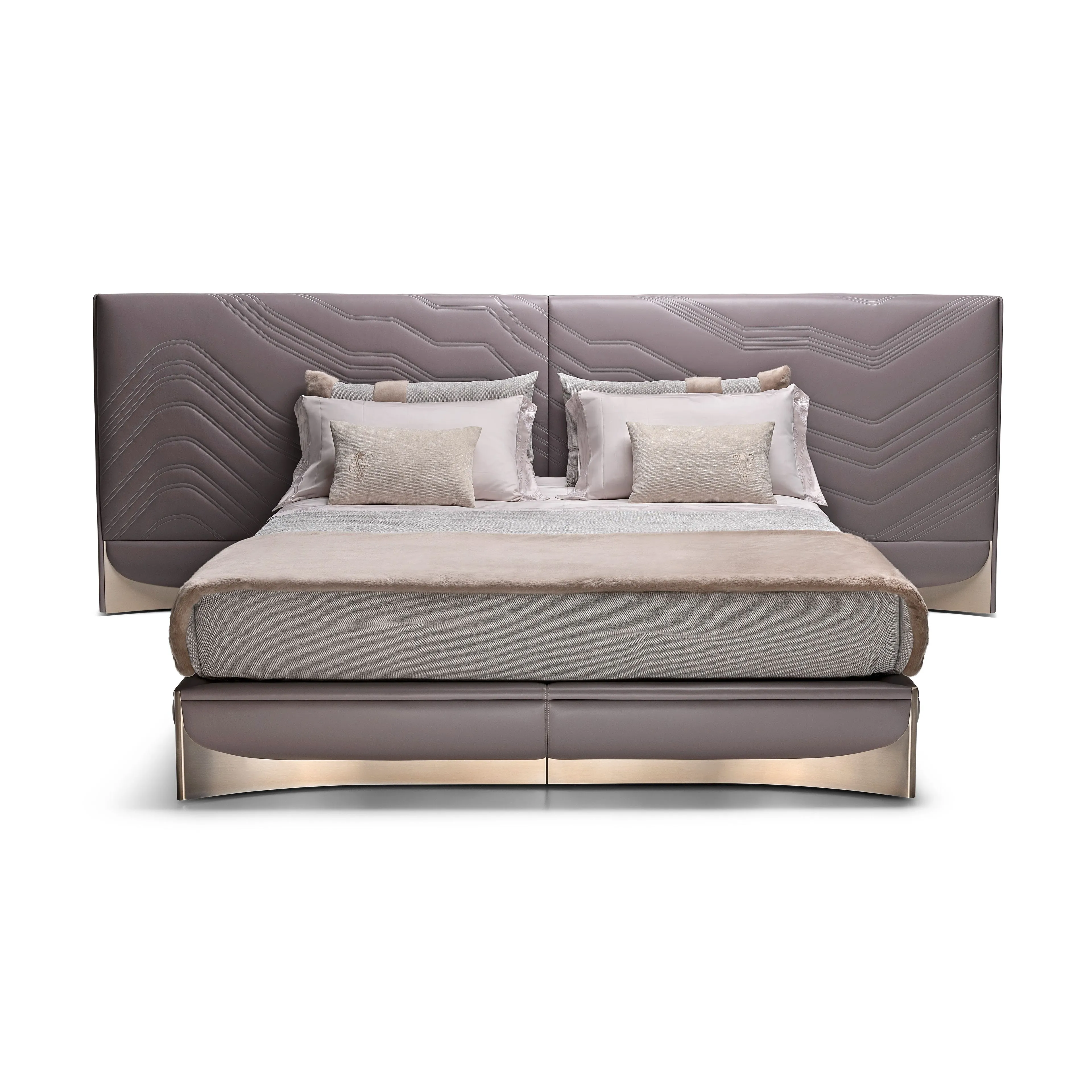 Фигурное основание изголовья и основание кровати выполнены из дерева и покрыты изогнутой нержавеющей сталью с вогнутым профилем. Изголовье и основание кровати поставляются в разобранном виде. Декоративные металлические элементы могут быть покрыты любым лаком из предложенных на выбор.