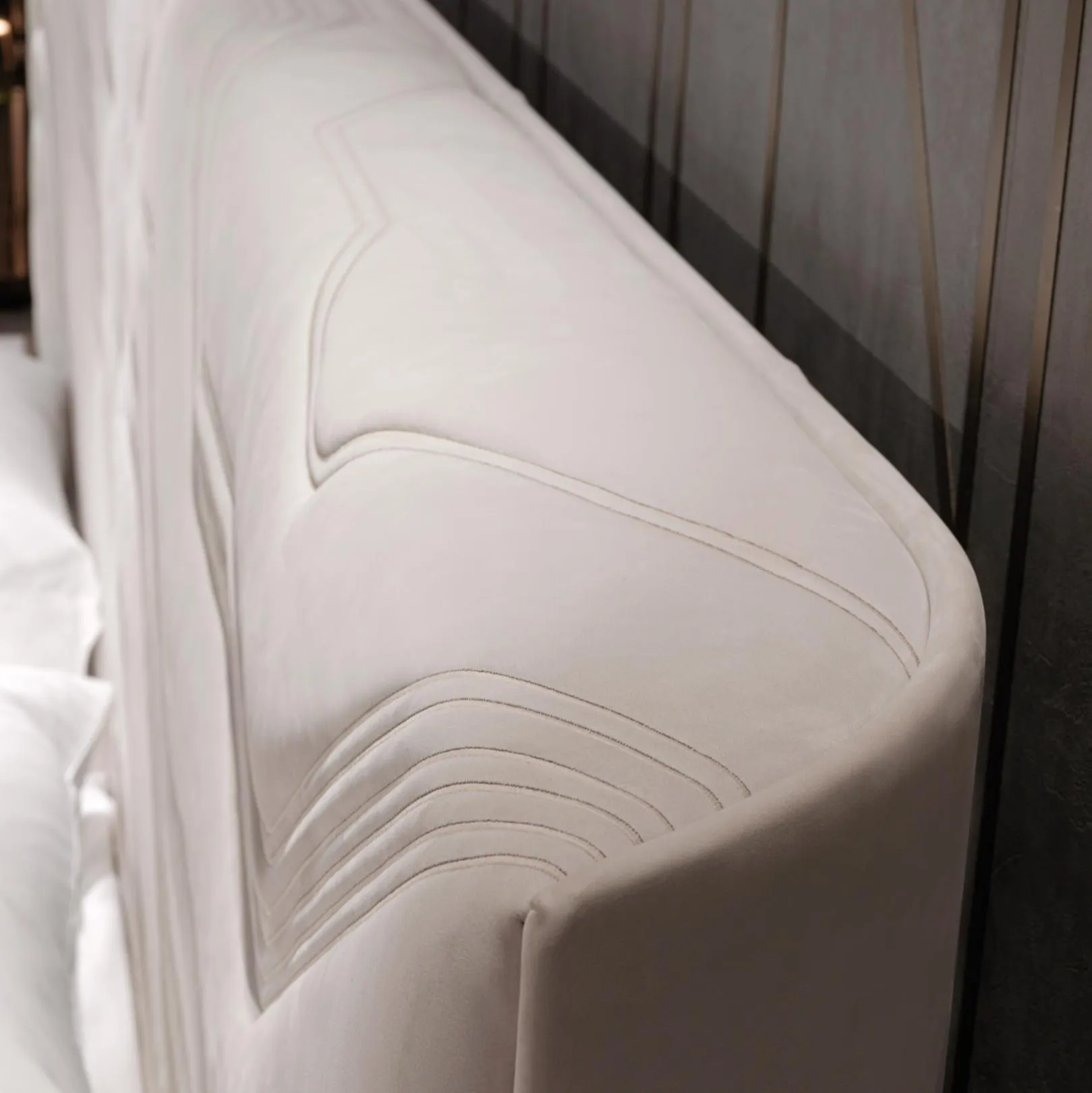 Изголовье кровати украшено специальной стеганой вышивкой. Профилированное основание кровати с закругленным профилем. Конструкция из фанеры и массива дерева со встроенными деревянными рейками, обивка из пенополиуретана различной плотности.