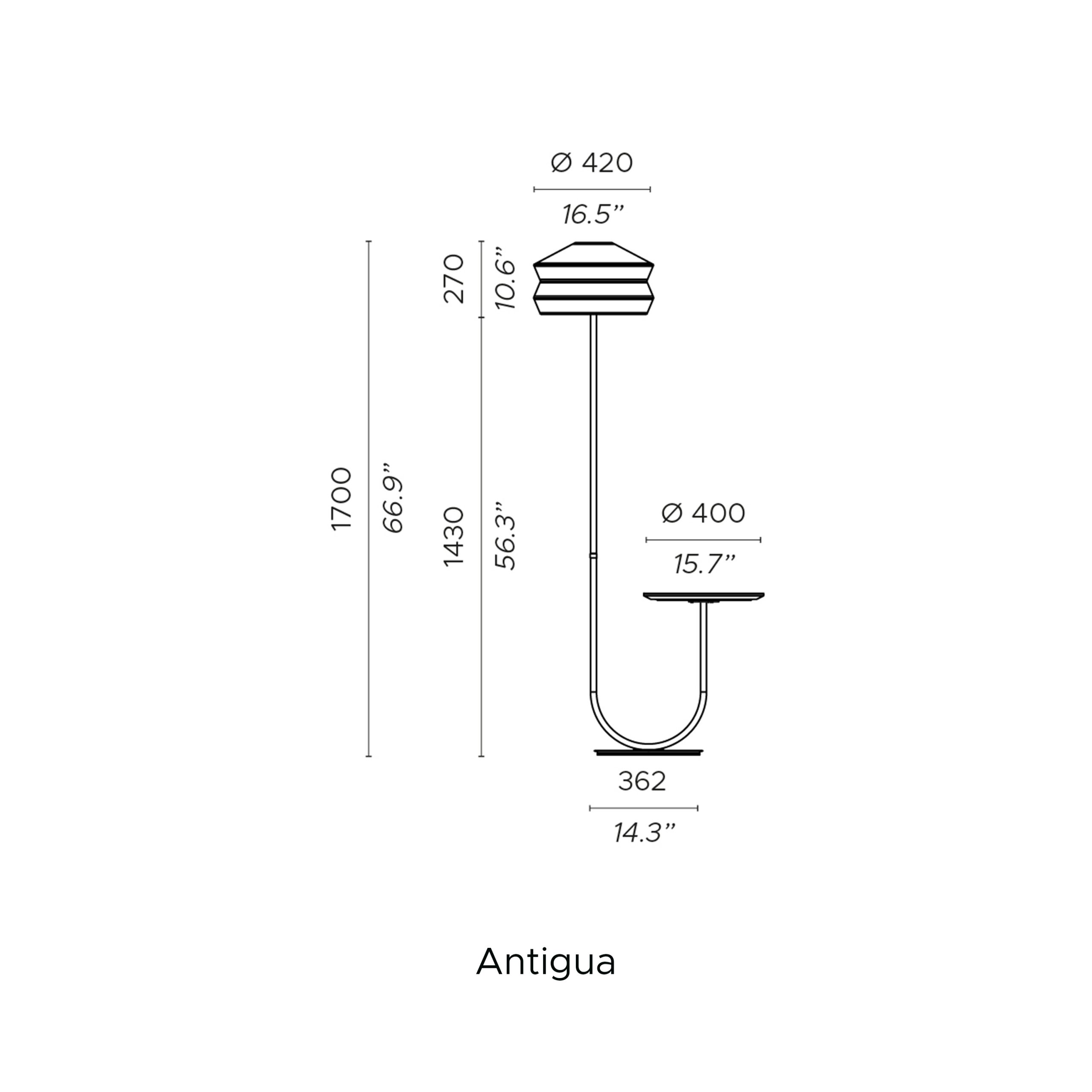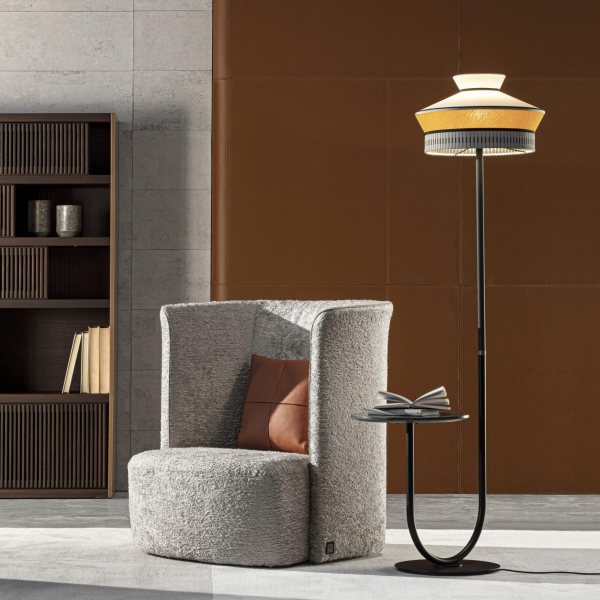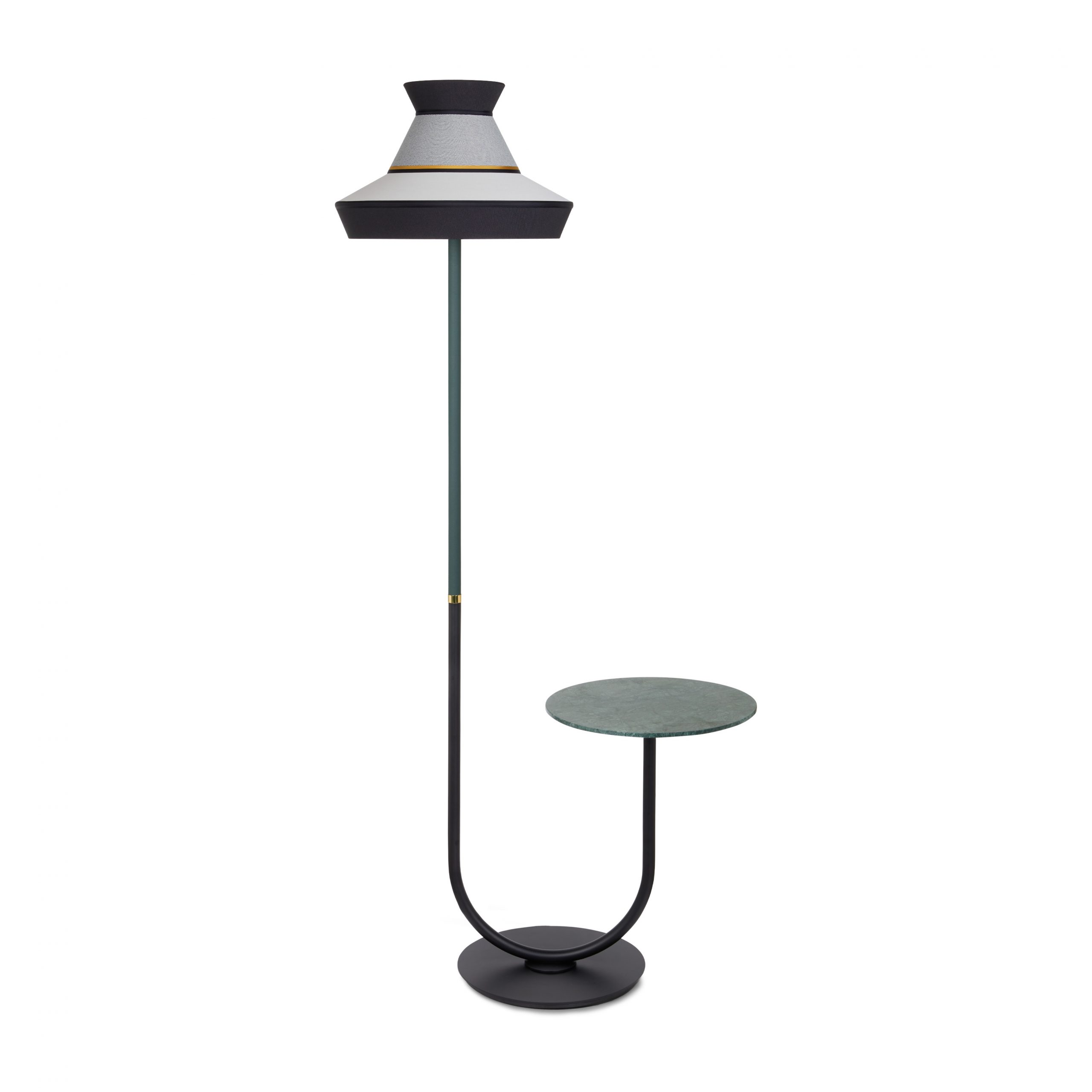 Contardi и Servo motor решили добавить в коллекцию напольную версию для помещений с возможностью установки навесного стола. Каждый абажур изготовлен из высококачественных водонепроницаемых и огнеупорных тканей, гипоаллергенных и нетоксичных материалов, а нижняя часть и основание светильника покрыты черным лаком. Верхняя часть покрыта мягкой кожей, а все детали выполнены в едином стиле с отделкой из латуни. Функциональный, но в то же время изысканный журнальный столик изготовлен из зеленого гватемальского мрамора, который хорошо гармонирует с яркими цветами абажуров.