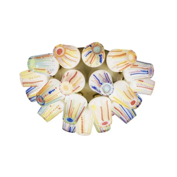 Потолочный декоративный светильник Lasvit Candy Ceiling Sconce Half Sphere - это не только эффектный источник света, но и яркий взрыв эмоций. Братья Кампана перенесли свое детское увлечение стеклодувным мастерством во взрослую жизнь. Результат мы можем наблюдать в серии ламп Кэнди. Художники были вдохновлены разноцветными конфетами, популярными на рынках Бразилии. Яркие цвета поднимают настроение и создают ощущение праздника. Мастера перенесли это состояние в свои творения и получилась невероятная игра света и оттенков. Светильник Candy имеет золотое зеркальное основание, скрытое за множеством ламп, от него отражаются лучи и кажется, что сияние исходит изнутри. Плафоны из белого стекла подобны зефиру, а многоцветный декор напоминает теплую глазурь, стекающую вниз. Приятная мягкая подсветка создает ощущение уюта. Потолочная люстра Candy подходит для различных интерьеров.