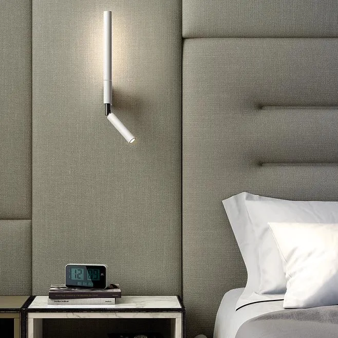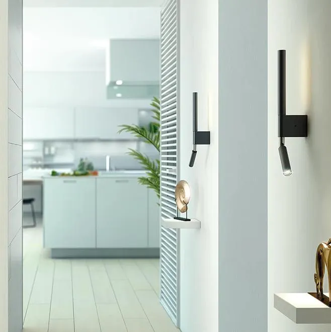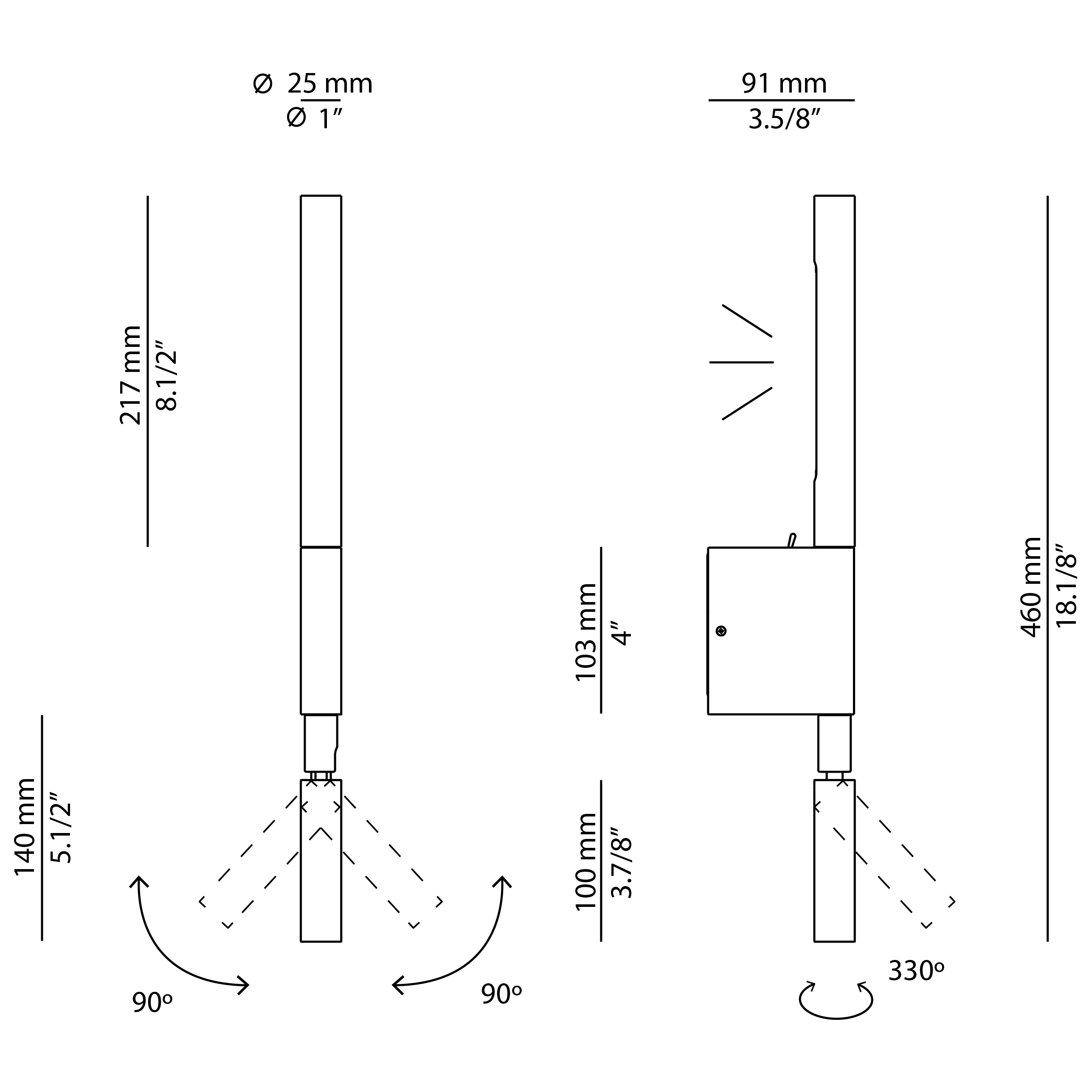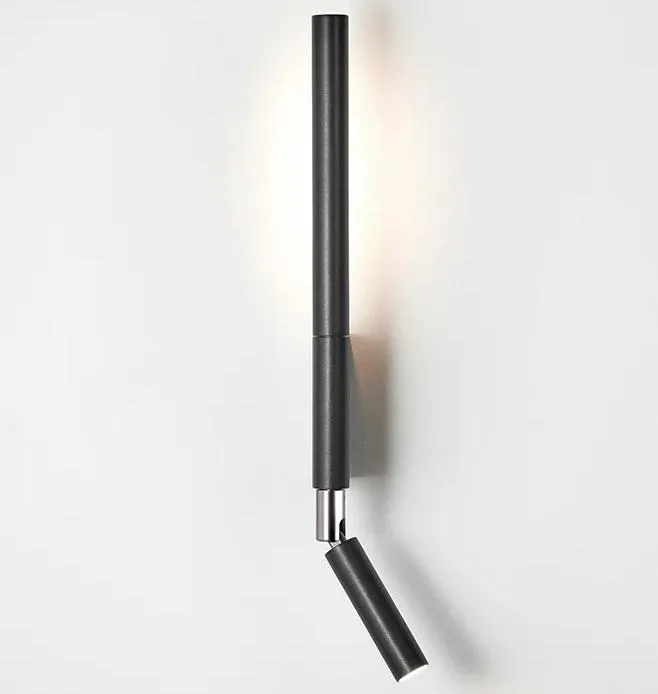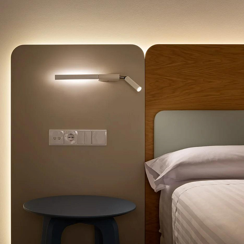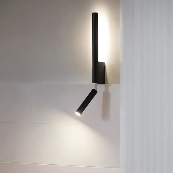 Металлический настенный светильник с фиксированным кронштейном, обеспечивающим непрямой свет, и одним регулируемым кронштейном для чтения, обеспечивающим прямой свет. Встроенный светодиод и независимый кнопочный выключатель для настольной лампы.
