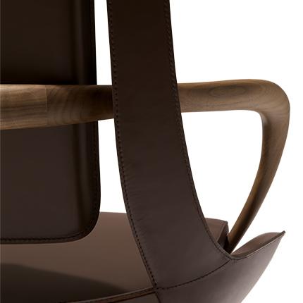 Кресло со спинкой из профилированной стали, сиденьем из полимера (композитный материал полиэстер/полиуретан) и подлокотником из массива орехового дерева каналетто.