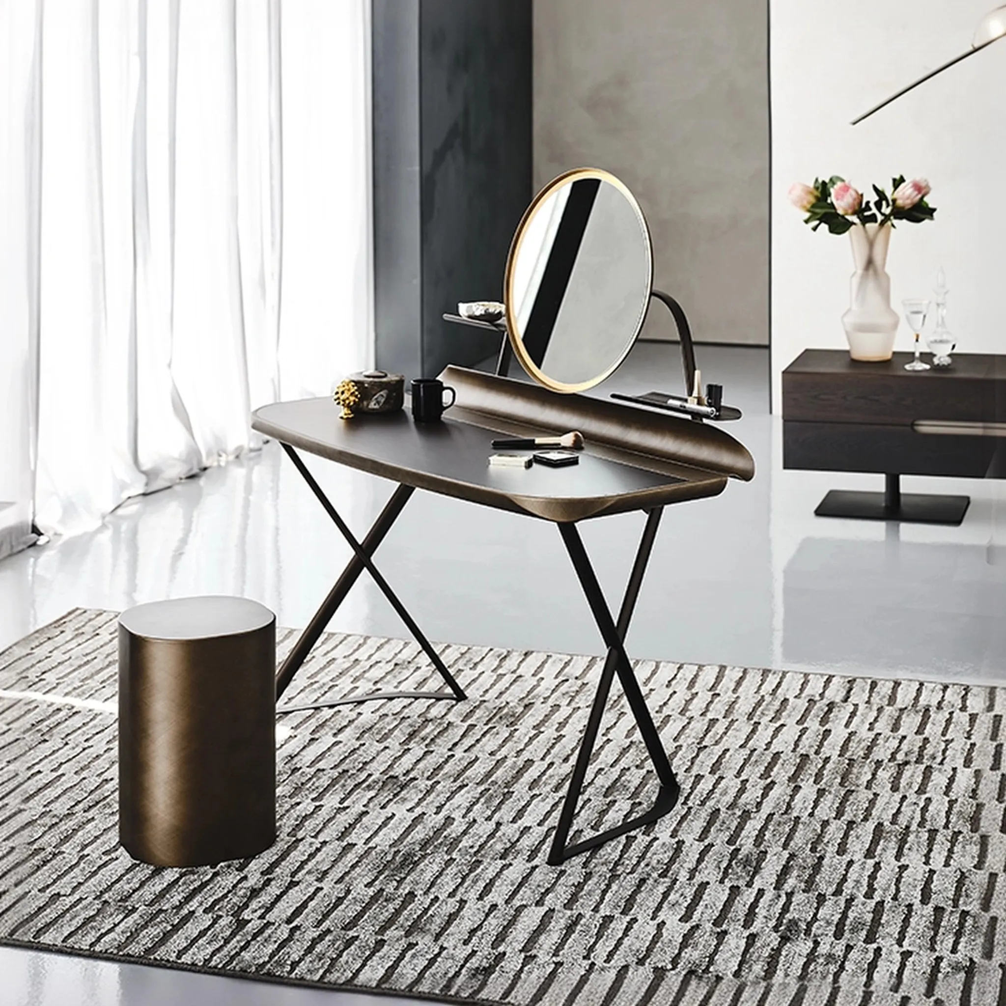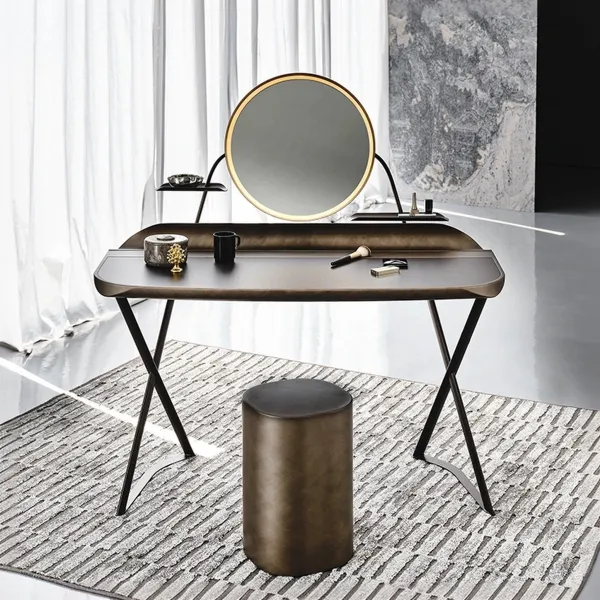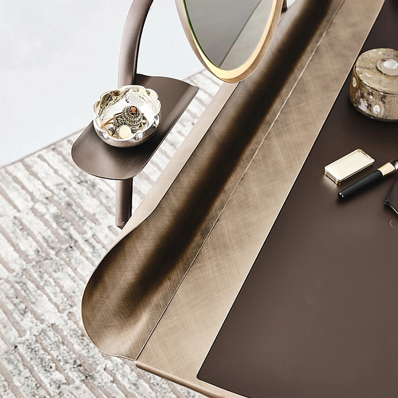 Туалетный столик с базой из стали, окрашенной в гофрированный титан (GFM11), бронзу (GFM18) или черный (GFM73). Столешница из твердой кожи в цветах согласно образцам с нижним закругленным профилем, окрашенным в Brushed Bronze или Brushed Grey и с перчаточным ящиком из стали, окрашенной в Brushed Bronze или Brushed Grey. Зеркало из стали, окрашенной в гофрированный титан (GFM11), бронзу (GFM18), черный (GFM73), Brushed Bronze или Brushed Grey с боковыми опорами и полками из стали, окрашенной в гофрированный титан (GFM11), бронзу (GFM18) или черный (GFM73). С LED освещением. Цветовые и брашировочные колебания отделки Brushed являются характерными для изготовлений ручным способом и не должны расцениваться как дефекты.