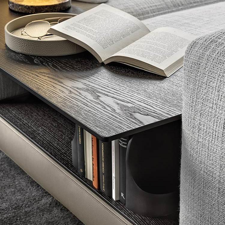 Полки с откидными створками повторяют ленточный дизайн конструктивного основания и делают систему функциональной, предлагая стильные поверхности для размещения предметов. Покрытые кожей или шпоном ясеня Мока, они гармонично сочетаются с текстурой покрытия.