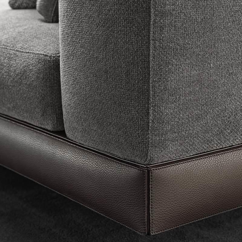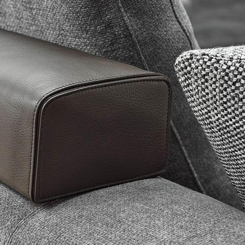 Конструктивное основание, приподнятое над полом на тонких ножках из экструдированного алюминия с лакированным покрытием цвета бренди, расположено спереди, что придает дивану привлекательный и воздушный вид и напоминает металлические детали чемоданов.