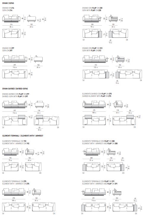 Благодаря своей геометрической строгости основание создает оригинальный контраст с мягкостью сиденья, выполненного в виде цельной подушки, украшенной легкой строчкой, определяющей ширину сиденья - 83 или 68 см, а также со структурой спинки и подлокотника, покрытых набивкой из гофрированного гусиного пуха. Спинка и подлокотник образуют единый объем с углом наклона 45°.