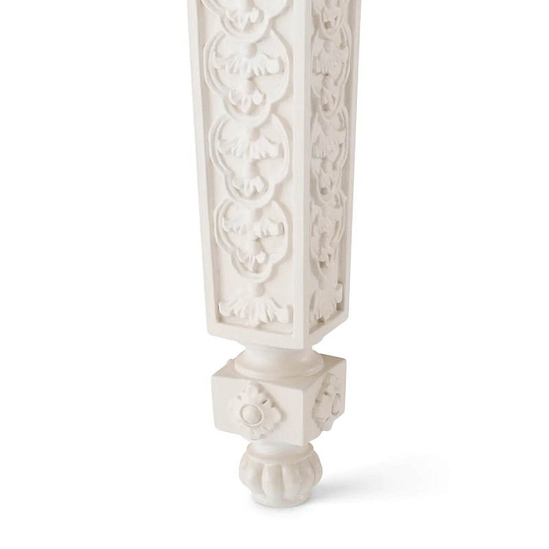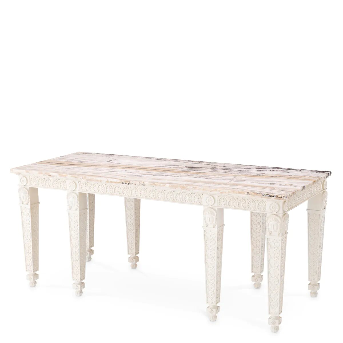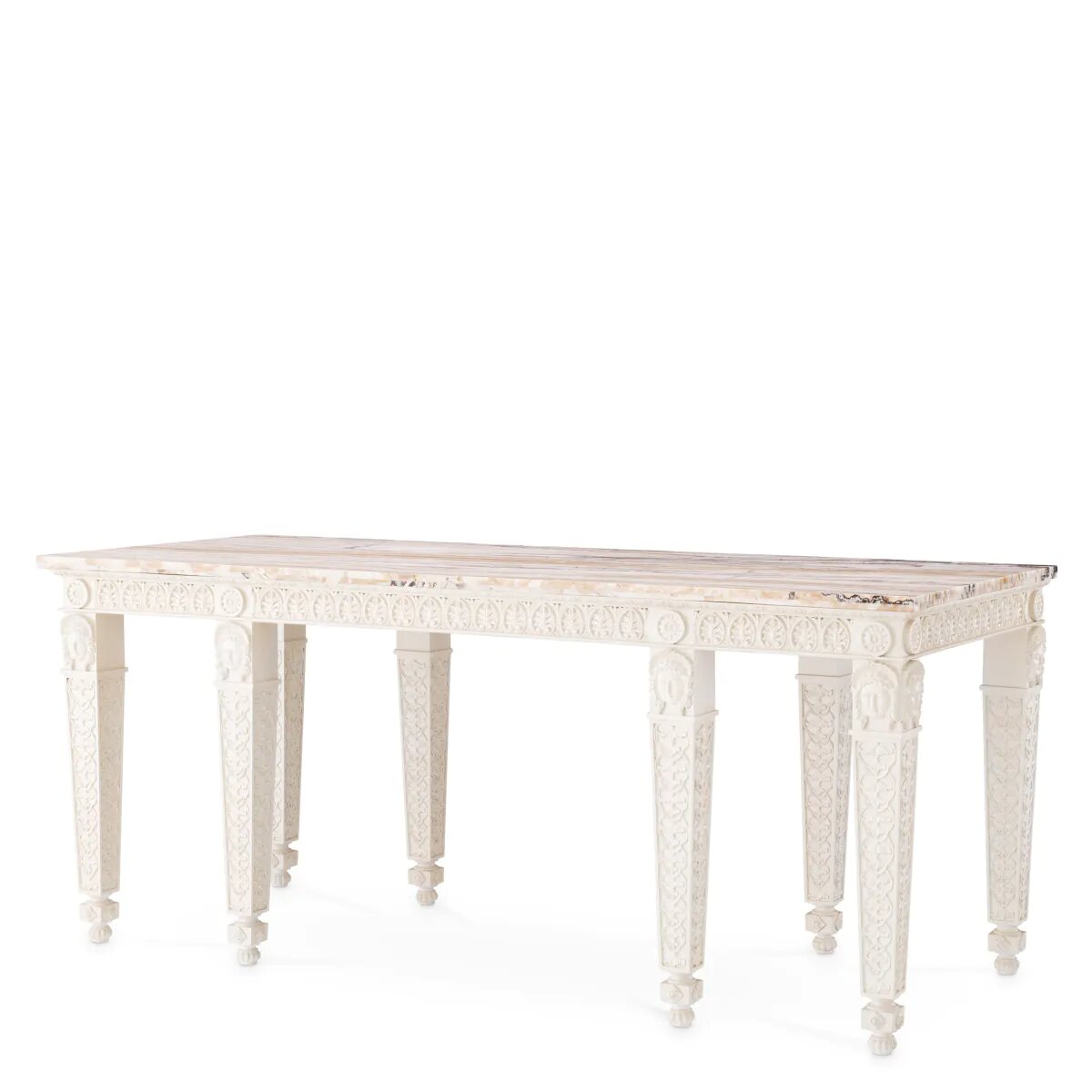 Стол с белой отделкой под старину и мраморной столешницей. Его дизайн отражает изысканную, почти кинетическую энергию штукатурки Alken, в которой органично сочетаются историческое очарование и современная элегантность.