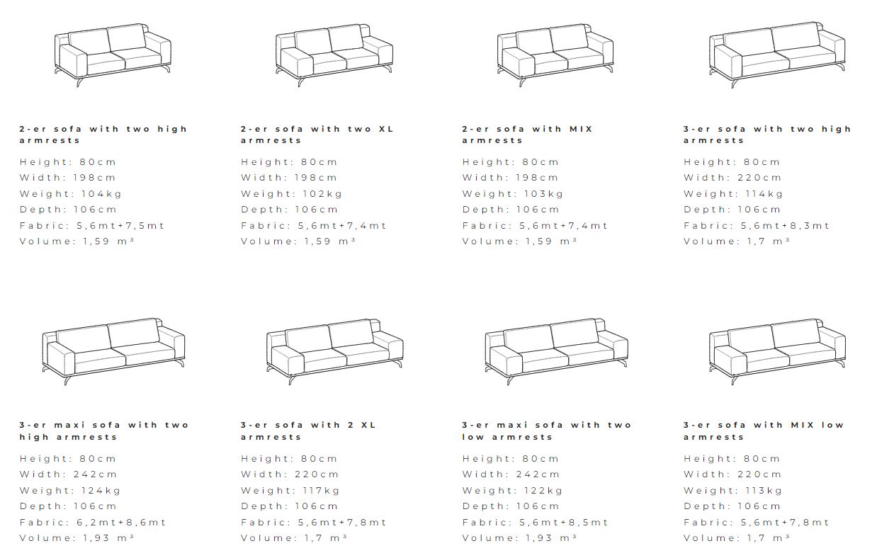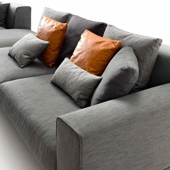 Доступен с обивкой из полностью съемной ткани или со съемными подушками из кожи или экокожи, с несъемными чехлами по всей конструкции.