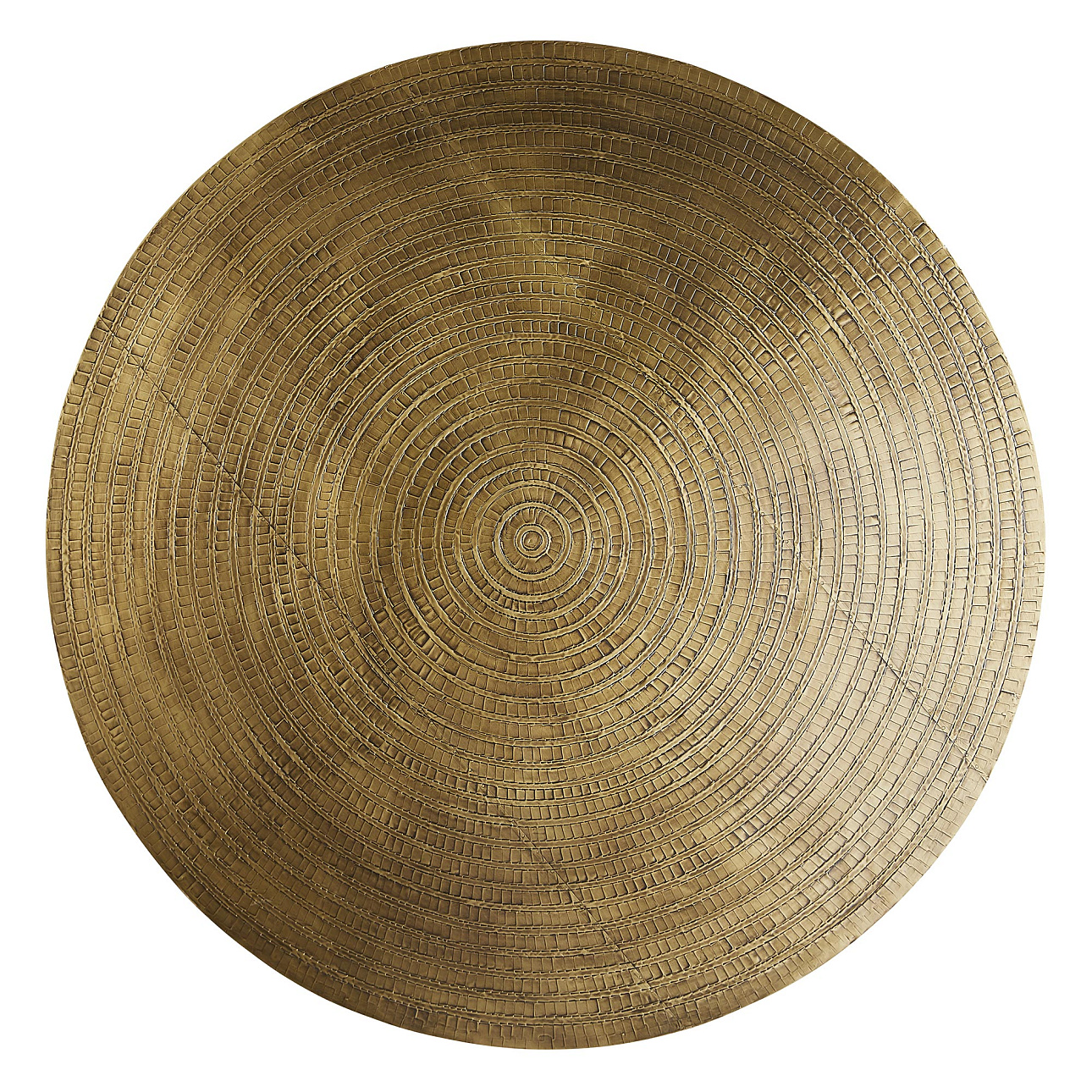 Стол имеет коническую алюминиевую основу, которая покрыта античной бронзовой отделкой. На деревянной столешнице с античным латунным покрытием вырезаны кольца, чем-то напоминающие возрастные кольца деревьев. Поверхность столешницы имеет потертый винтажный вид, который придает ей особый шарм.
