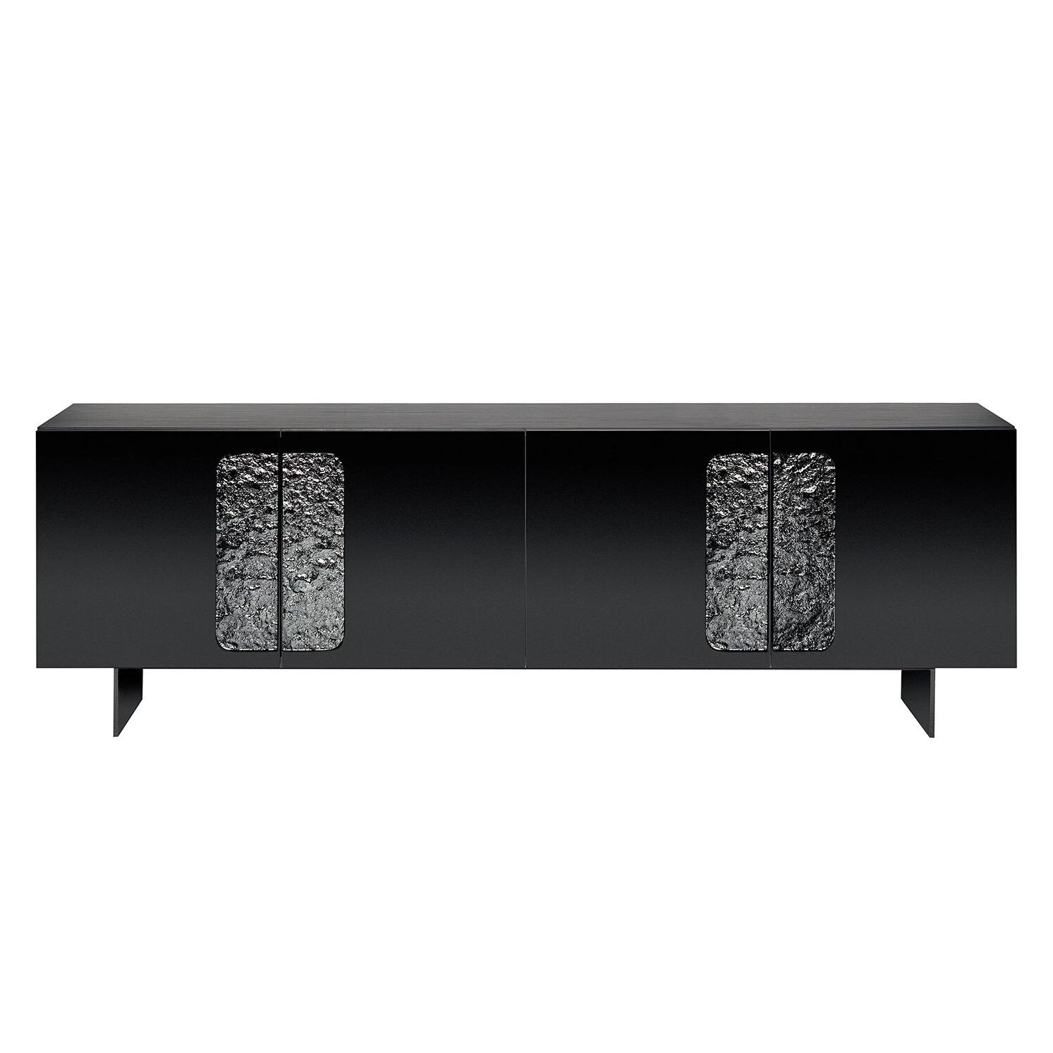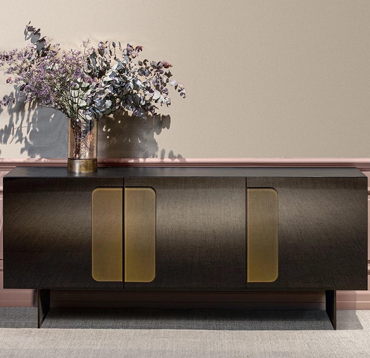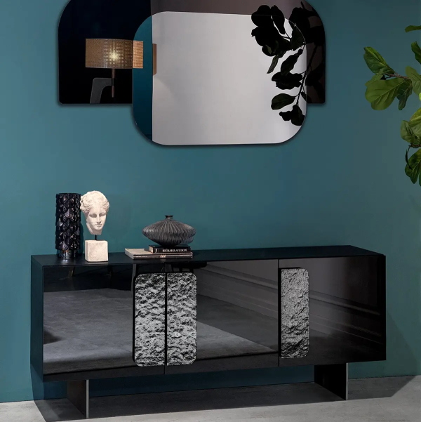 Конструкция комода Debussy состоит из трех или четырех дверей из черного стекла, отличающихся особыми ручками с отделкой из чеканного серебристого стекла, функциональными деталями, которые становятся ярко выраженными элементами, словно напоминающими клавиши пианино.