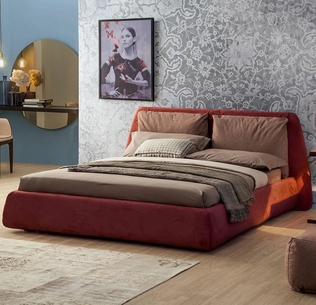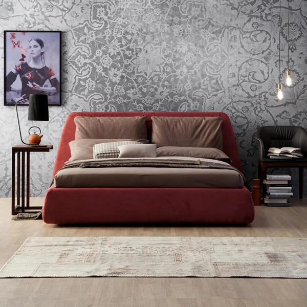На Dharma следует смотреть спереди, с позиции, откуда вы можете заметить идеально выровненное кольцо, соответствующее изголовью кровати, точное соединение, стыки которого почти невозможно заметить. Округлая линия изголовья кровати подчеркивает цвета и фактуры тканей и кожи, контрастируя с большой центральной подушкой и ее конструкцией.